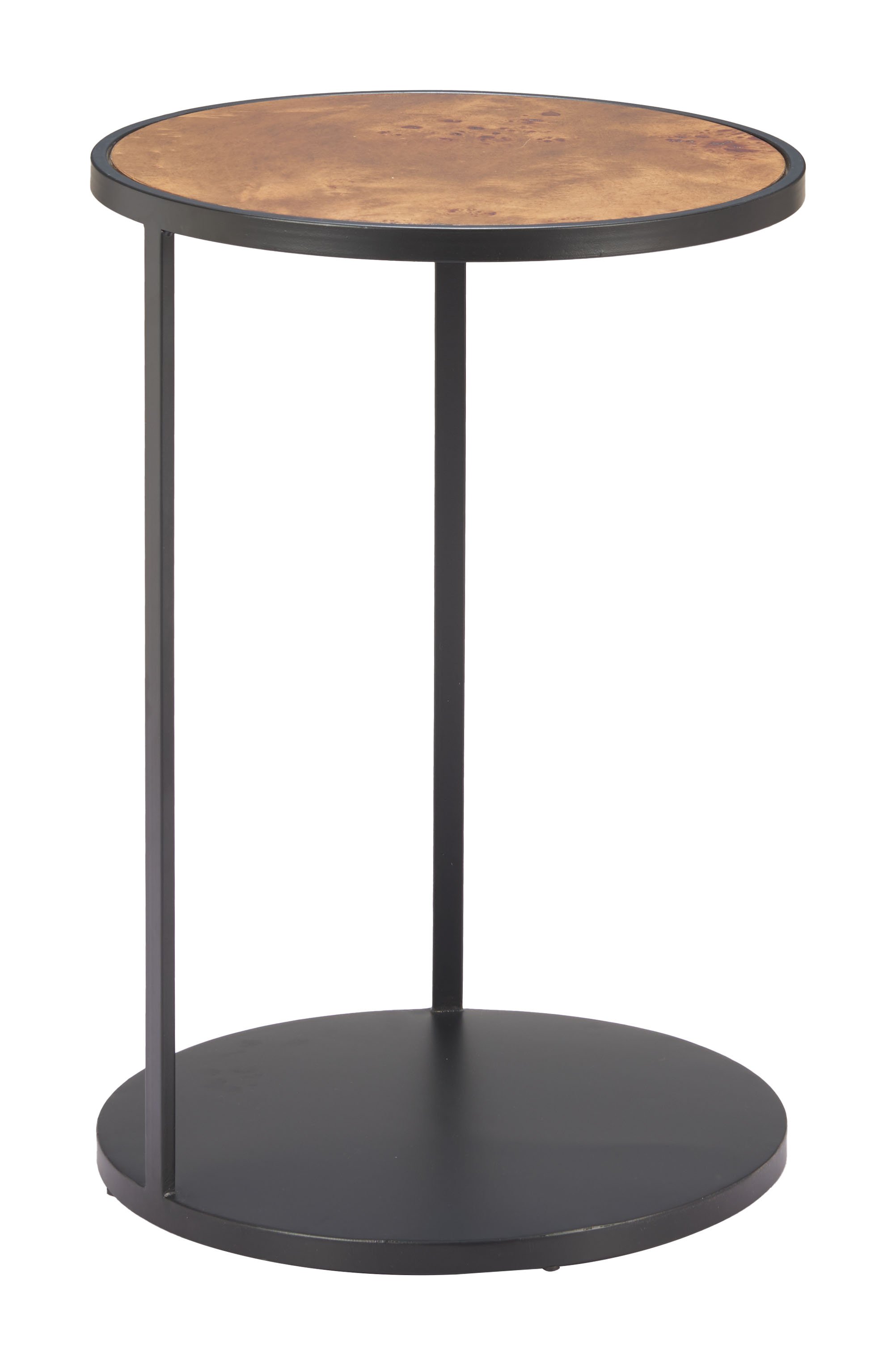 Showcasing a sleek brown and black finish, the Nodo Side Table combines modern charm with durable burl veneer MDF and iron construction. Ideal for hospitality use, it creates a refined look in any space.