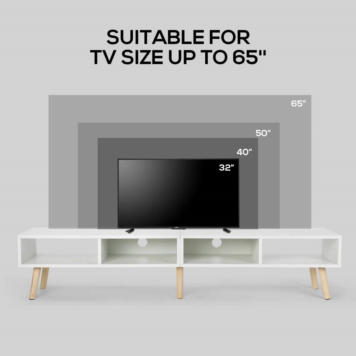 Do you enjoy watching movies with family in the living room, playing video games with friends in the game room, or having a quiet film night in bed with a meal tray? This Modern Mid-Century Style TV Stand in White with Wood Legs for TVs up to 65-inch is designed to complement your favorite leisure activities. It features a simple and minimalist design with four open shelves for storage and display, allowing you to organize your media devices and collections. The classic color design ensures it will seamlessly match your existing furniture, while the sturdy structure and cord management feature provide practical functionality. Crafted from durable particleboard, this piece of furniture will be a reliable companion for years to come, allowing you to enjoy your favorite series in comfort.