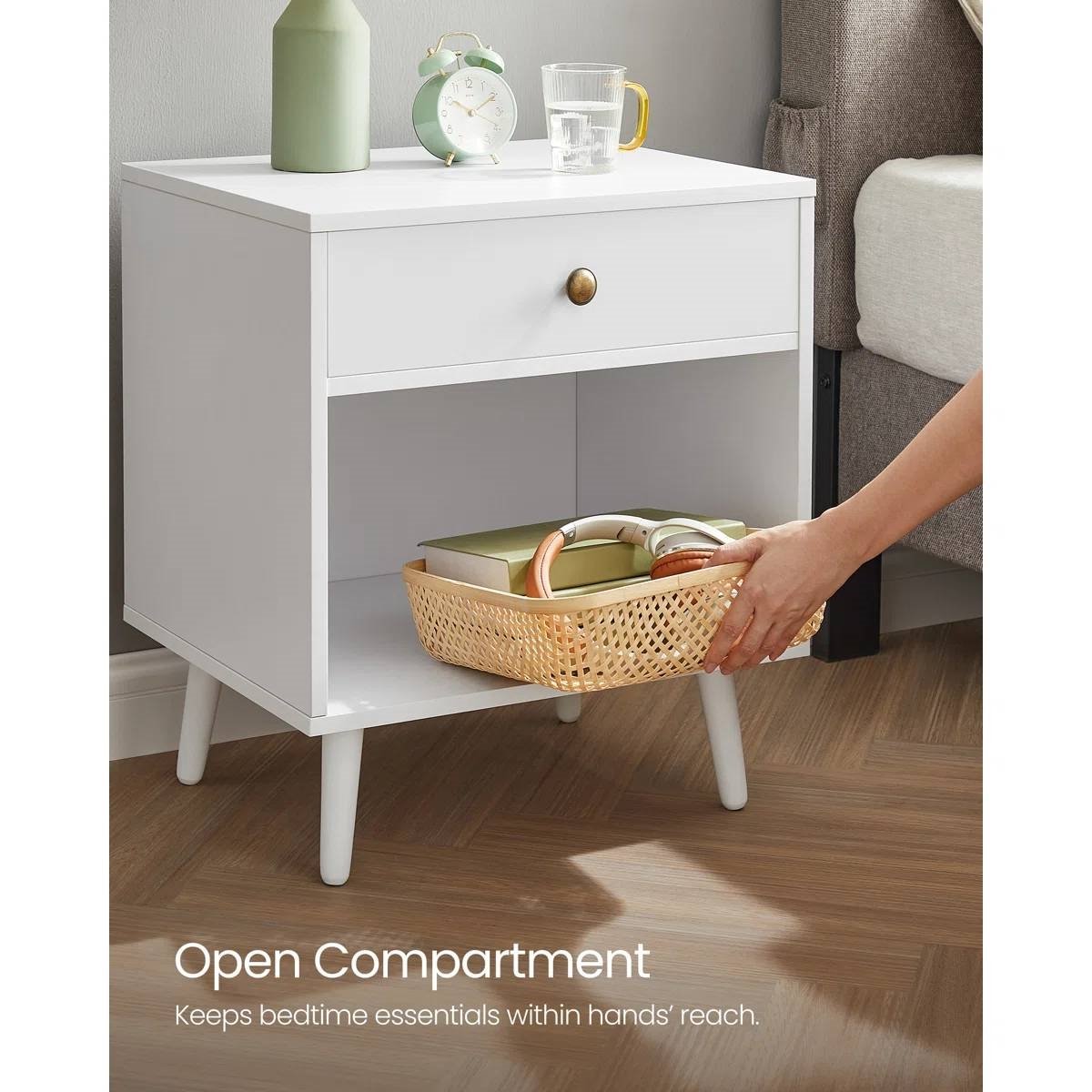 • Store what you need with a top surface for your lamp with a radiant glow, a drawer for your secrets, and an open compartment for your novels, you can keep all the bedtime essentials close at hand, and don't need to get up when you've gotten under the covers.