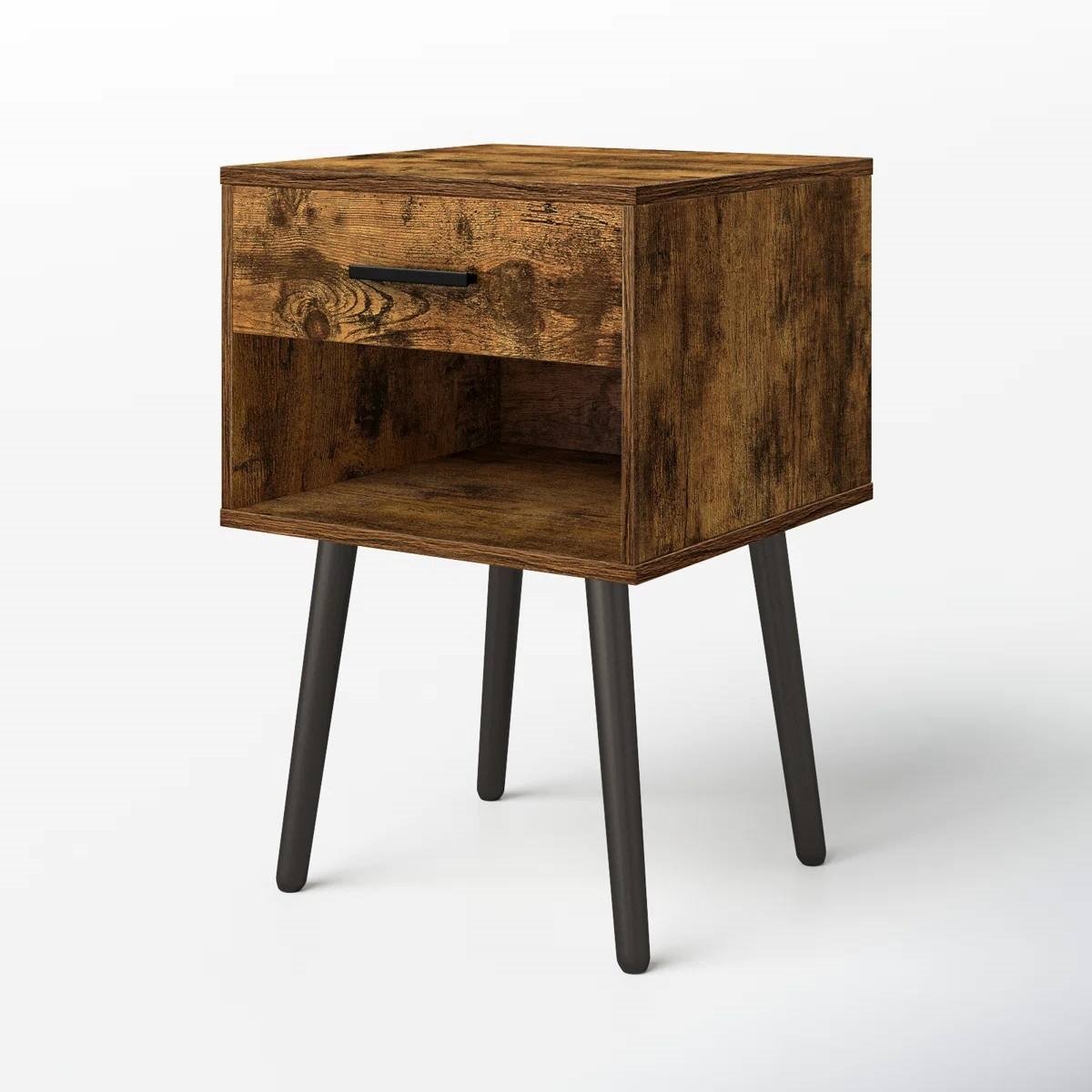 Add an elevated look to your bedroom with this Mid-Century Modern Farmhouse 1-Drawer Nightstand with Open Shelf that's full of mid-century modern charm. Crafted from solid and engineered wood, it rests on four angled, tapered dowel legs that emulate the iconic style. A weathered rustic brown finish contrasts with the black tone of the legs to round out the design. An upper drawer and a lower shelf provide plenty of room for all your bedtime necessities. At 15.75" wide, this bedside table is ideal for space-conscious locations around your home.