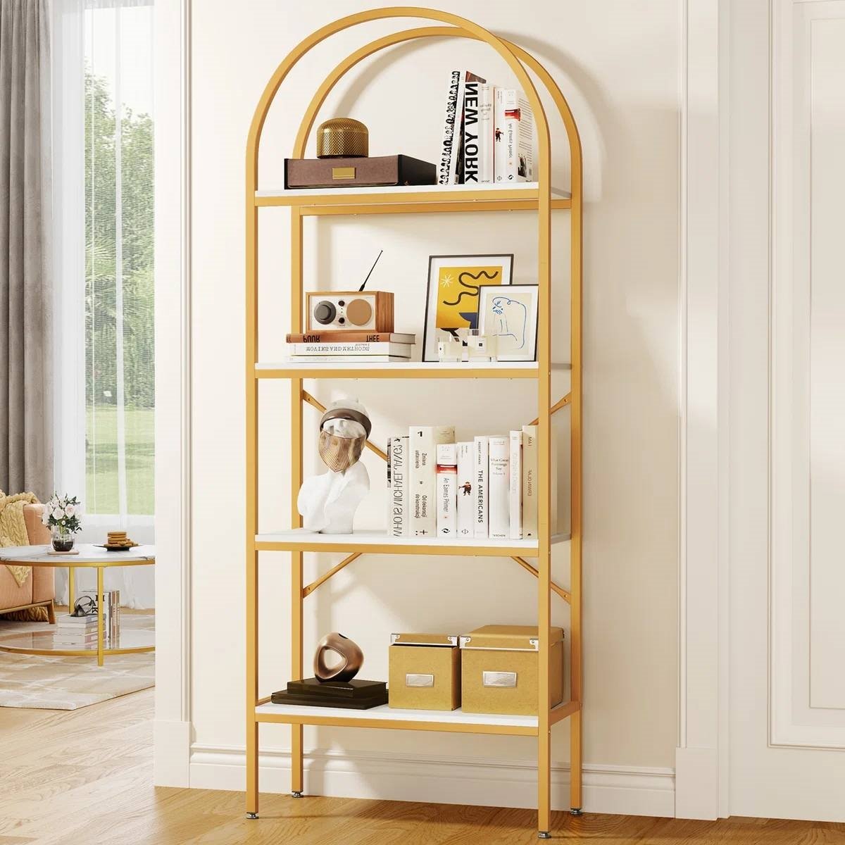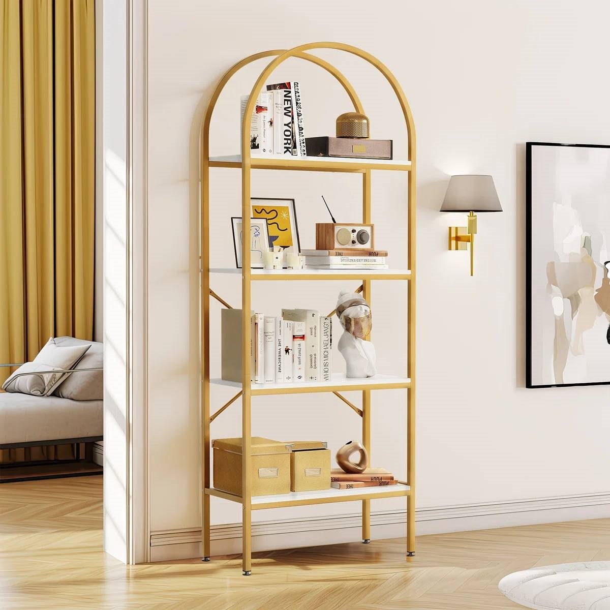 Make a statement in your living room or home office with this Modern Arched Top Gold Frame Display Rack Bookcase with White Storage Shelves. It's crafted with a freestanding, gold-finished frame that's crafted from steel, and it showcases an arched silhouette that measures a little over 71" tall. This bookcase comes with four tiers of wooden shelf space to display everything from books and accent pieces to succulents and records. We love how the white finish on the shelves complements the golden hue, while its scratch-resistant design stands up to regular use. Plus, this bookcase has an X-shaped brace on the back for additional support.