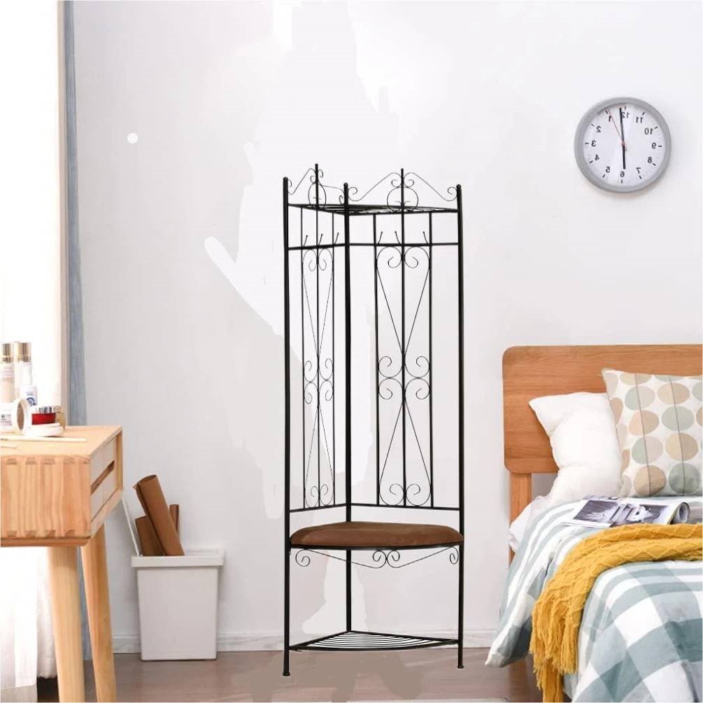 • Black Metal Scrolling Corner Hall Tree Coat Rack Storage Bench