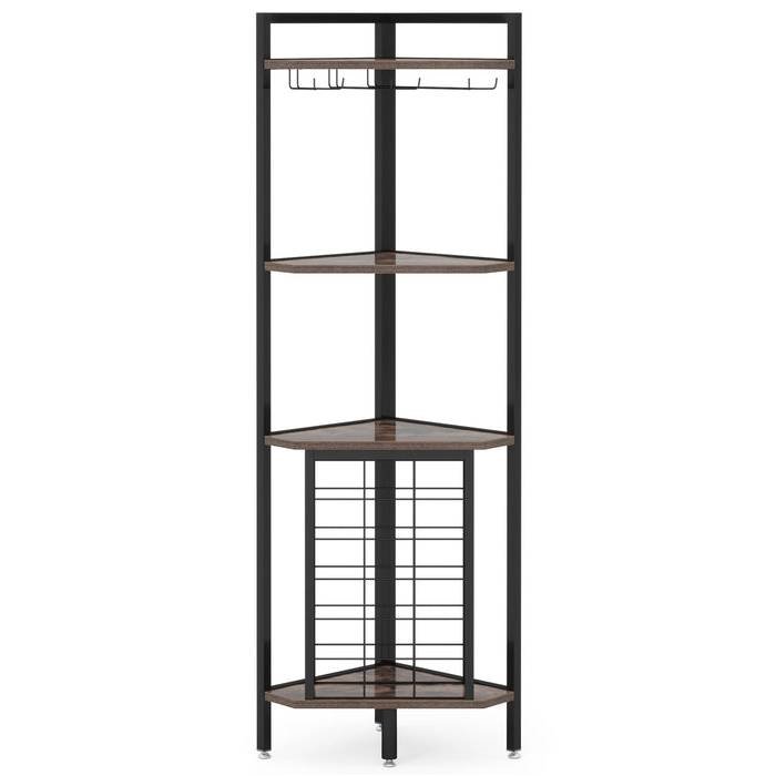 Maximize your wine space with this Rustic 4-Tier Corner Wine Rack with Glass Holder Storage! This corner wine rack astutely combines storage and display needs. Its sleek 90° design comfortably fits in various corner spaces. The rack conveniently holds 18 liquor bottles horizontally and 3 open shelf tiers for glasses, decanters, and cocktails. Equipped with 6 glass holders, it is ready for instant "home bar time". With a textured walnut veneer and industrial black metal frame, it serves as a wine/cigar/coffee station, kitchen rack, or bookshelf. Showcasing a vintage design, it elegantly accents your living or dining room. Made from thickened MDF and durable metal frame assures stability. Adjustable feet protect the floor and a secure strap provides wall mounting for added safety.
