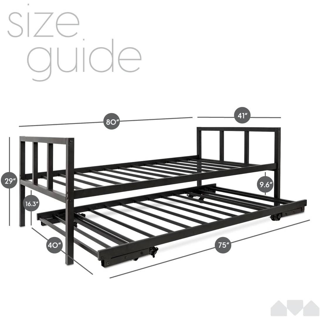 • Twin Heavy Duty Black Metal Daybed Frame with Roll-Out Pop-Up Trundle Bed Frame