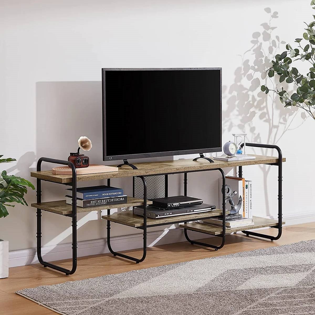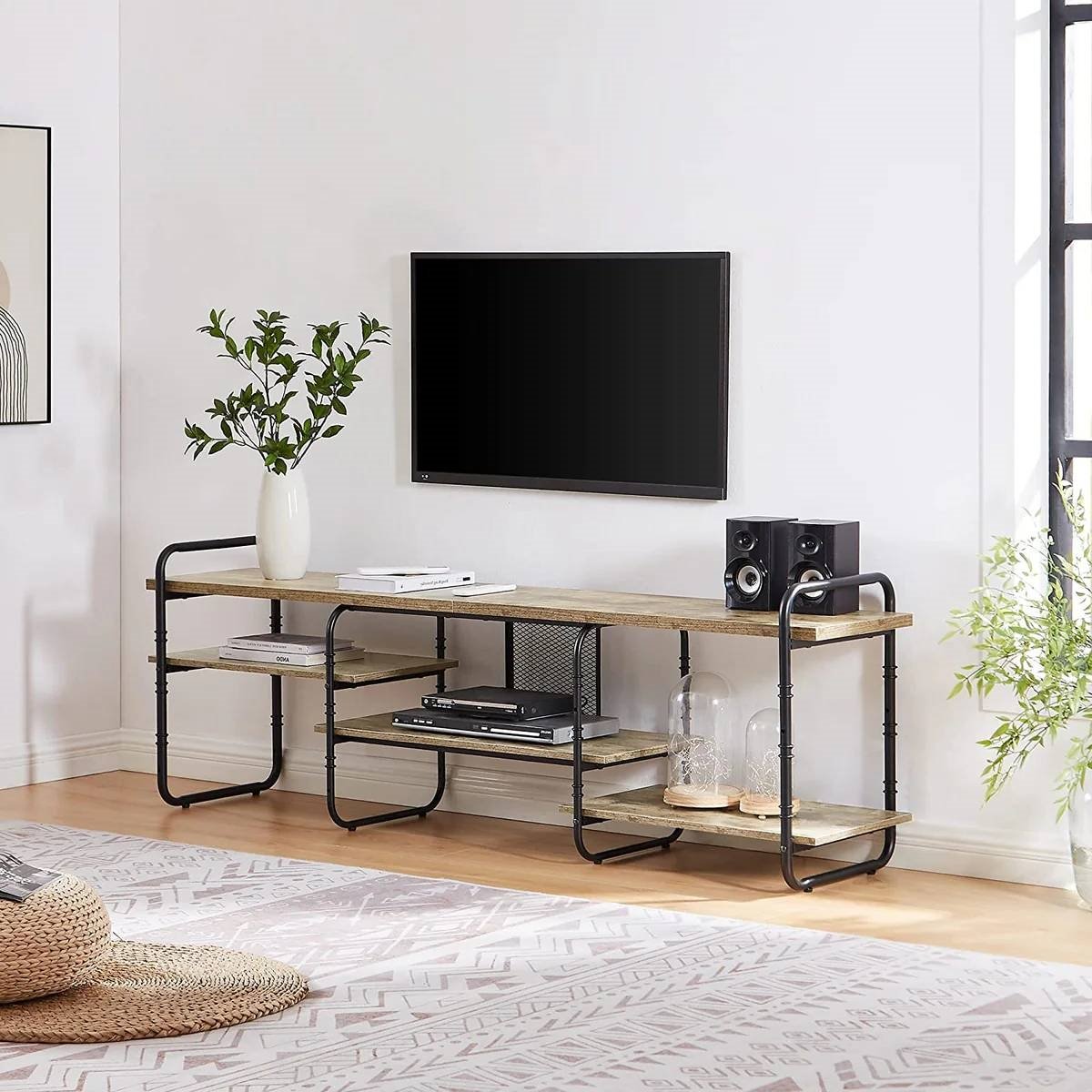 The Modern Grey Wood Black Metal Entertainment Center TV Stand for TV up to 75-inch is made of solid engineered wood and metal frame. It is sturdy and not rickety. The metal tubes are tightly under the board which could provide the enough support for loading capacity. Each of the middle board could hold up to 59lb. The industry console table has two colors (brown and grey) and three size (55/63/71 inches) for you, which fits the TV range up to (65/75/84 inches). With upgrading of material, this TV table is waterproof. Only one damp cloth will help you quickly and easily clean the stain. The entertainment center table has a large tabletop for your TV and items. At the same time, the TV stand features 4 separate shelves areas, which could provide enough space for your DVDs, media and other ornament items. All parts of the TV stand are clearly labeled, the hardware and tools are packed in a box, no additional tools required. With our easy-to-follow instructions and instructional videos, these parts are not too hard to put together by yourself. Get a chance to enjoy relaxing hands-on time!