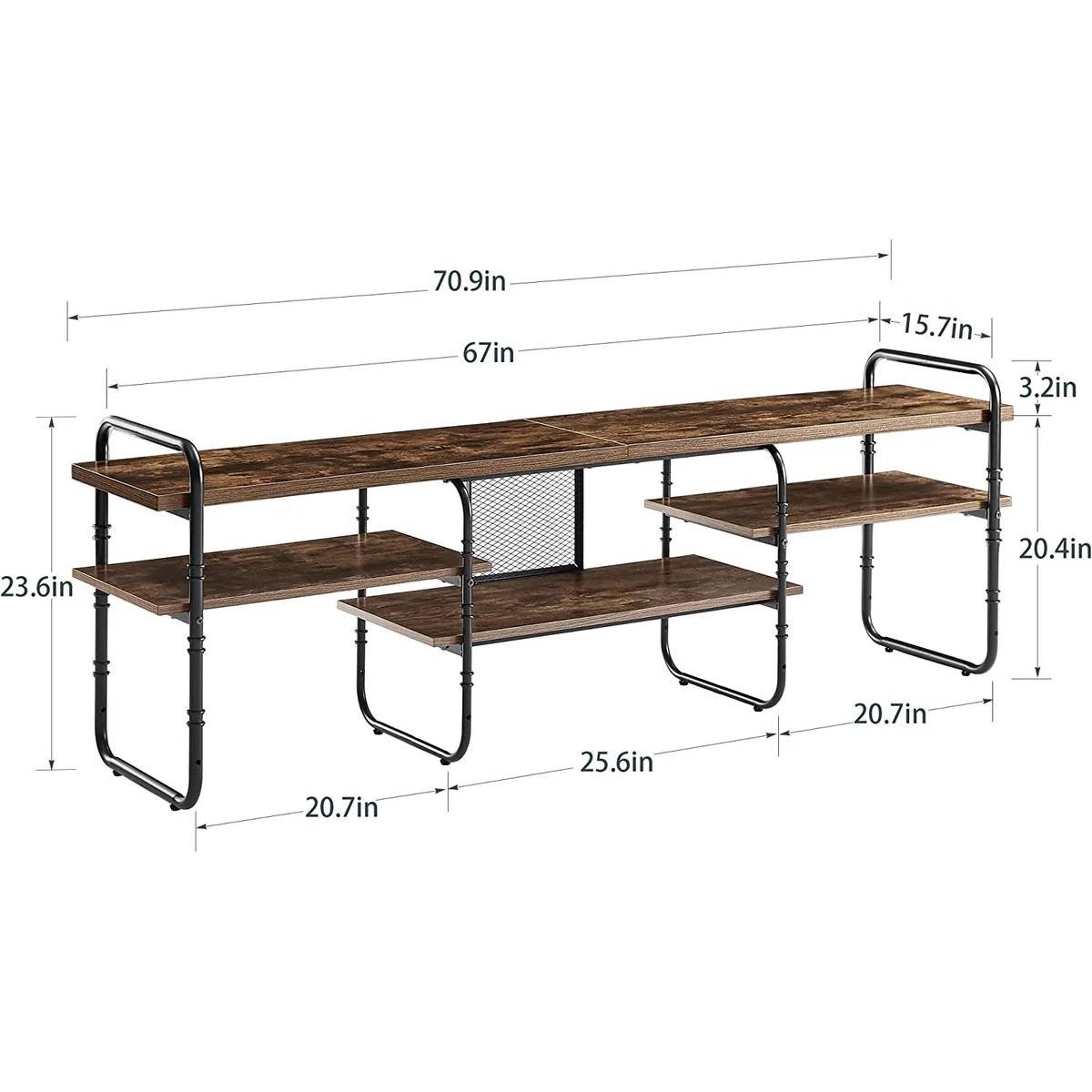 The Industrial Modern Metal Wood Entertainment Center TV Stand for TV up to 75-inch is made of solid engineered wood and metal frame. It is sturdy and not rickety. The metal tubes are tightly under the board which could provide the enough support for loading capacity. Each of the middle board could hold up to 59lb. The industry console table has two colors (brown and grey) and three size (55/63/71 inches) for you, which fits the TV range up to (65/75/84 inches). With upgrading of material, this TV table is waterproof. Only one damp cloth will help you quickly and easily clean the stain. The entertainment center table has a large tabletop for your TV and items. At the same time, the TV stand features 4 separate shelves areas, which could provide enough space for your DVDs, media and other ornament items. All parts of the TV stand are clearly labeled, the hardware and tools are packed in a box, no additional tools required. With our easy-to-follow instructions and instructional videos, these parts are not too hard to put together by yourself. Get a chance to enjoy relaxing hands-on time!