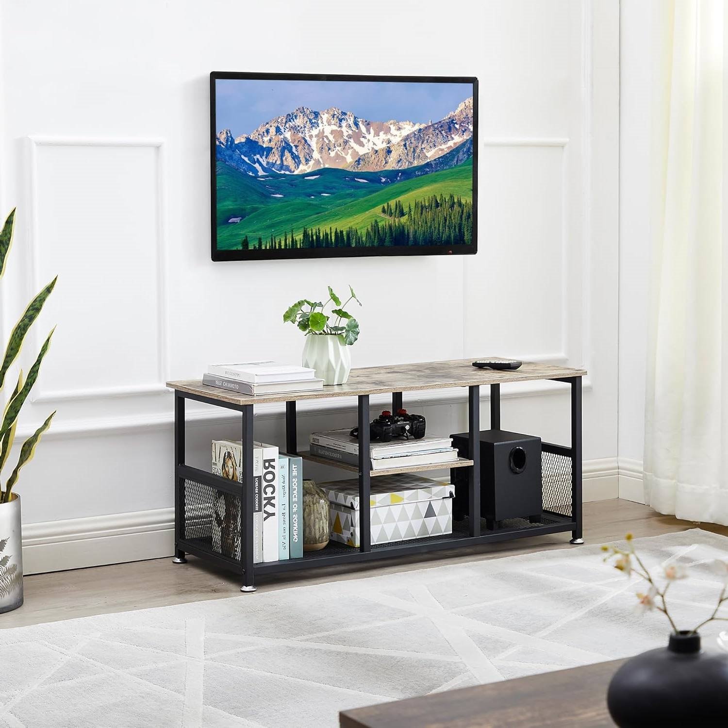 This Industrial Modern Black Metal Grey Wood TV Stand with Media Storage Shelf features retro finish wood grain and black metal frames to create a warm and inviting vibe, which can easily match any living room decor. Adding novelties to your home.Dimensions: 39.37"(L) x 15.7"(W) x 17.7"(H). TV stand constructed of quality particle board shelves and industrial mesh shelves, top surface supports up to 130 lbs. and mesh shelves support up to 44 lbs. The adjustable foot pad ensures it is more stable on an unbalanced floor. Featuring a spacious tabletop for accommodating TVs 25-50 inches, and 2 tiers of open storage shelves for your DVDs, a loudspeaker, remote controls, magazine, or anything you like, this tv stand make your room organized. This TV table can be used on many occasions, such as in the living room, bedroom, office, and so on. Not only used as a TV stand but also as a coffee table. Easy to clean with a wet cloth. All the parts are clearly labeled, the instructions are very easy to follow, and you can finish the assembly in 30 minutes.