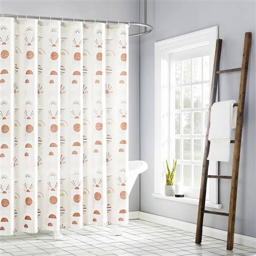 Breathe new life into your bathroom decor with the 72-inch Cream White Orange Sunset Bohemian Pattern Shower Curtain. Showcasing a boho inspired printed design, this 72-inch Cream White Orange Sunset Bohemian Pattern Shower Curtain is the complete solution to keeping floors free of splashing water. The buttonhole top design allows for easy ring installation and sturdy hanging. This set includes 1 printed shower curtain, 12 plastic rings for easy sliding, and 1 mini tote printed with the same design. The water-resistant mini tote is great for toiletries, shoes, the beach, shopping, or lunch on the go. Machine wash cold on gentle cycle. Use non-chlorine bleach when needed. Tumble dry on low heat, using a cool iron as needed.