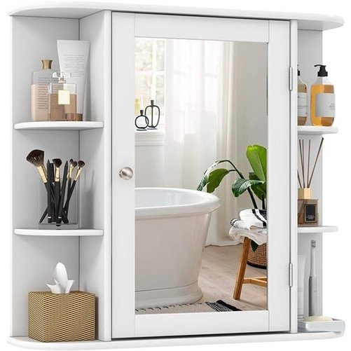 This White 26 x 25 inch Bathroom Wall Mirror Medicine Cabinet with Shelves combines the functions of storage and mirror well. According to your varying requirements, not only are you able to use a clear mirror, but you can also stow a variety of bathroom essentials behind the mirrored door. On each side of the wall mounted medicine cabinet, there are 3 fixed fan-shaped shelves to store those often-used objects. Behind the door, 3 adjustable and removable shelves can be found. Each of them is available in 3 various positions, fitting objects of different heights. This wall-mounted medicine cabinet provides a perfect solution for small bathrooms. It helps maximize the wall space without taking any floor area. Coming with 2 wall-mounting devices, the bathroom wall cabinet can be fixed to the wall tightly. The wall mounted medicine cabinet has a simple yet modern appearance that matches different bathroom styles well. More importantly, apart from in the bathroom, you can also use the versatile wall cabinet in the bedroom or entryway. Coming with illustrated instructions, numbered parts and all the hardware, it is easy to assemble the storage cabinet. You can complete the assembly work in a short time.
