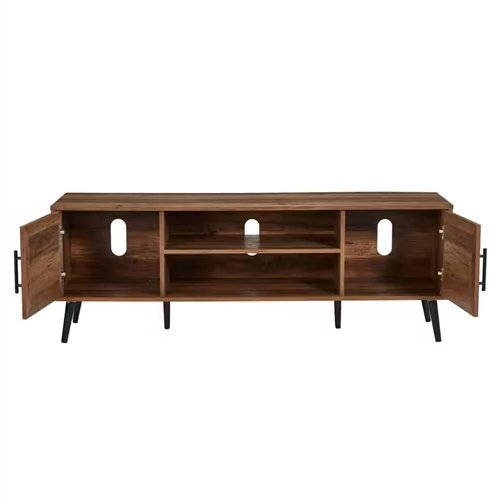 This Modern Rustic Wood Finish TV Stand with Mid-Century Legs - for TV up to 65-inch lets you display decorations, TVs, plants, and more while keeping your home organized and stylish; Comes in a mid-century modern look. Side cabinets with handled doors add extra storage space for your remote controls, media devices, DVDs, and gaming accessories, keeping your entertainment center tidy. Comes with a cut-out cable hole at the back of the shelves to conveniently organize your device cables discreetly, maintaining a clutter-free entertainment area. With middle open shelving, allowing you to store decor, cable boxes, books, plants, and collectibles, all while enhancing the aesthetics of your room. Ideal for use with TVs up to 65 inches across or 150 pounds; Overall dimensions (L x W x H): 59.06 x 15.56 x 20.87 inches, providing ample storage and display space.