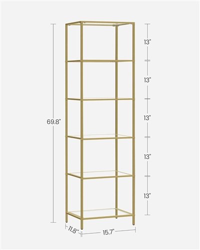 This Narrow Glass Shelf Bookcase Bedroom Living Office Bath Storage Unit in Gold sized at 11.8"D x 15.7"W x 69.8"H easily fits the narrow space between your counter and your fridge or the corner of your bathroom. With a robust steel frame and quality tempered glass shelves, this gold shelf boasts a high load capacity (max. load 60 lb for each shelf) for reliable support of your collectibles. Equipped adjustable feet keep the bookcase balanced even on slightly uneven floors; provided an anti-tip kit helps you secure it to the wall for added stability and safety. Display trinkets in the living room, store toiletries in the bathroom, keep books in the home office, prop up photo frames in the bedroom—the glass shelves work like a charm anywhere you need. Numbered parts and easy-to-follow instructions will help you finish the assembly of this glass bookshelf effortlessly.