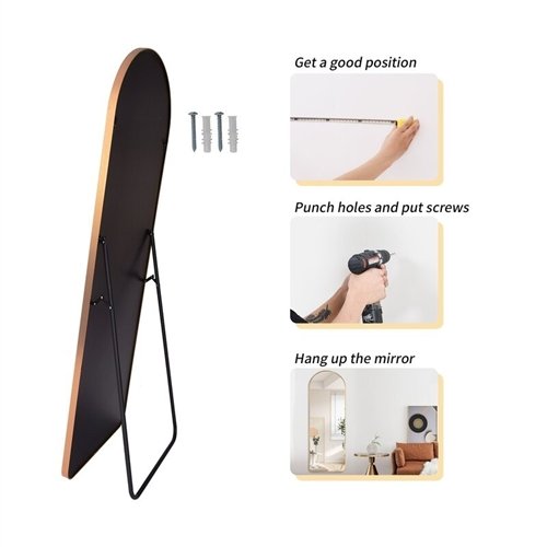 This Gold Large Full Length Rounded Leaning Wall or Hanging Mirror is made up of aluminum alloy and float glass. The rounded corner design is safer and protects against scratches. The elegant arc design makes it more unique than traditional mirrors. HD float glass design with clear reflection without distortion. The mirror is perfect for reflecting both natural and artificial light to brighten your house. an be placed anywhere in your room or leaned against the wall. It can also be hung vertically and horizontally.