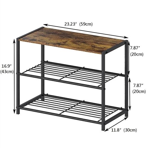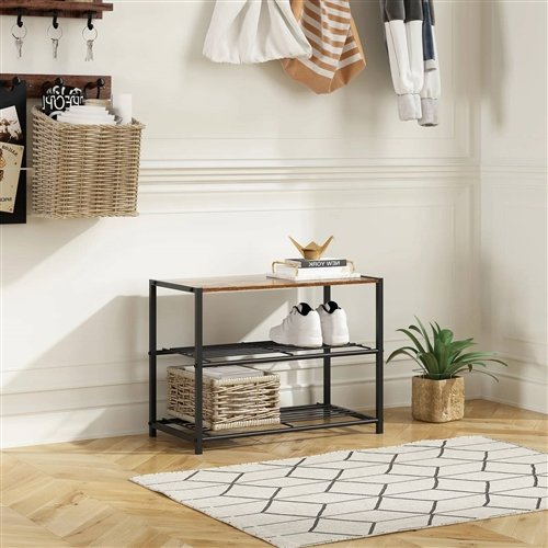 This 2-Shelf Entryway Shoe Rack Bench with Black Metal Frame and Brown Wood Top would be a great addition to your home. Modern Shoe Rack for Entryway: The wooden board in a rustic brown matches the black metal frame. MDF board to provide extra storage space for bags, bins, and more. 2 metal storage shelves to provide storage space for shoes, boots, high heels, and sneakers for an entryway, hallway, and bedroom. Exquisite and Compact Design: Each tier can accommodate 2-3 pairs of shoes, providing enough space for your family to put shoes; 3-tier /4-tier/5-tier-three specifications, solve the trouble of shoe storage at the entryway and save space. Safety and Health: Stable metal frame and plastic non-slip foot pads to prevent accidents from scratching your floor; MDF top board, the wood board will not bring toxic gas, protect your health, you can use our shoe racks with confidence. Easy to Assemble: All the accessories on our shoe shelf are marked with numbers, making it very easy to assemble with the instructions and tools included in the package.