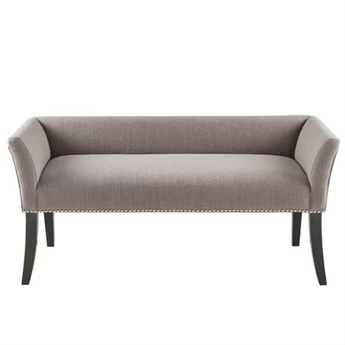 Give yourself a convenient spot to have a seat and kick your shoes off by the front door or punctuate the end of your bed in the master suite with this Modern Mid-Century Grey Upholstered Accent Bench. Founded atop four flared legs, its frame is crafted from solid and manufactured wood with a dark finish. The curved top is padded with foam, then wrapped in polyester and linen upholstery dotted with nailhead trim for a touch of glam.