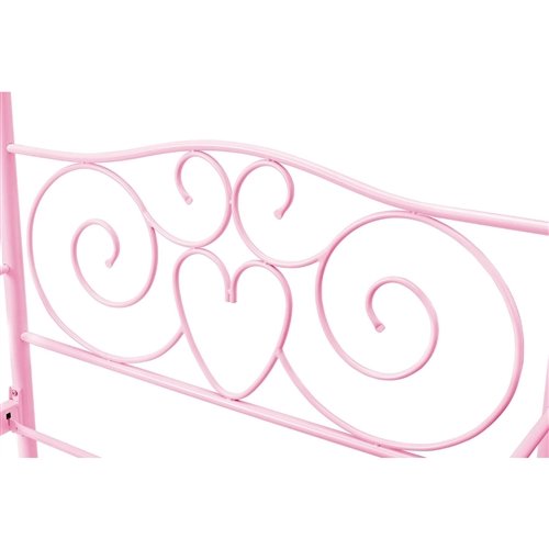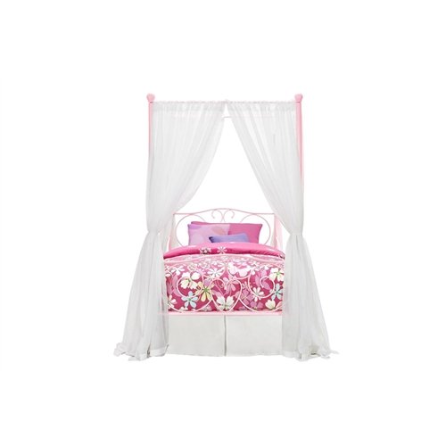 Make bedtime more enticing with this Twin size Sturdy Metal Canopy Bed in Pink. The embellished heart scroll design on both the headboard and footboard evoke an elegant, yet fun look to your princess's room. The four canopy posts, topped with gracious finials add the finishing touches to this delicate piece. Highlight its beauty even more by placing sheer curtains over the posts. The layered effect creates a special place for your little girl to play and sleep. Designed to fit a standard twin mattress, this bed includes metal slats that eliminate the need of a box spring.