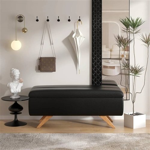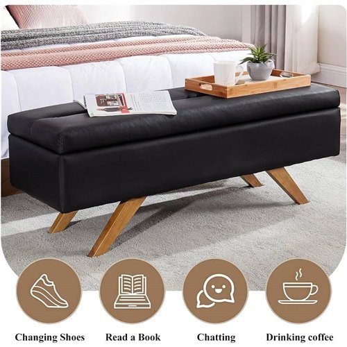 With a large capacity, our Mid-Century Modern Black Faux Leather End of Bed Storage Bench Ottoman neatly stows everything from your blankets and pillows to clothes. The hydraulic rod on the lid, unlike those with hinges, promises smooth, safe operation and efficient access to your items. Size and feel work together to determine how you feel when you sit on the bench. Measuring 44.49 x 15.75 x 16.14'' (L x W x H), this bench is just the right height, width and length. You can easily put on your shoes or keep your feet firmly planted on the floor without bending or extending your knees too much. With 6.1 "of storage space, it greatly enhances practicality. Easy to assemble in less than 5 minutes, the Upholstered Bench brings elegance to your living room, bedroom or entryway. Whether you place it at the end of your bed, in your entryway, or in your living room, you'll find that this bench is perfect for any space and is the ultimate finishing touch. Glide your hand over the smooth, easy-to-clean cover, then sink into the supportive 25D high-resilience foam that resists deformation. With PU Leather top, unlike those with fabric cover, this storage bench, offers both a cozy seat and effortless upkeep. With anti-noise foot pads, smooth hydraulic rods, our storage bench, keep you away from crunch-crunch, protecting your floors. The hydraulic rod achieves continuous and smooth motion, avoiding noise during opening and closing, eliminating the risk of sudden closure accidents.