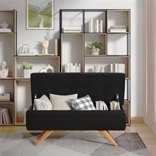 • Mid-Century Modern Black Faux Leather End of Bed Storage Bench Ottoman