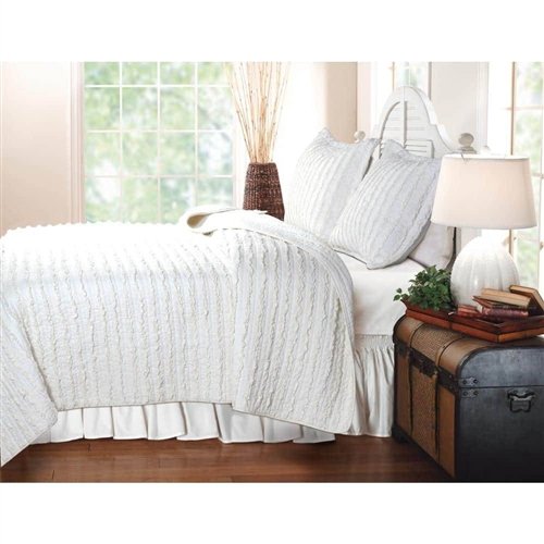 • King size 3-Piece Quilt Set with 2 Pillow Shams 100% Cotton White Ruffles