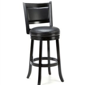 Accent your bar space with this classy and stylish Black 29-inch Swivel Seat Barstool with Faux Leather Cushion Seat. Its attractive and durable design is a perfect fit for all decor settings. It occupies less space and proves highly useful when you have guests at home.This stool has a solid hardwood construction that ensures it lasts for many years to come. The lustrous finish lends it a timeless look and adds to the appeal. It is fitted with a rich faux leather seat with high density foam to offer comfortable seating and enhance its appearance. It has flawlessly crafted French style legs with tempered bottoms. The steel ball bearings keeps it steady. The swivel ensures unrestricted movement. While the full ring footrest lends more strength and stability. The back support makes the seating experience more relaxed.The bar stool has a weight capacity of 250lbs. Its seat height is 29''. The overall dimensions of the bar stool are 43.5'' in height, 17'' in width and 18'' in depth. It is available in different shades to best suit your decor. This stool is best paired with an elegant bar table to complete the sophisticated look of your decor.
