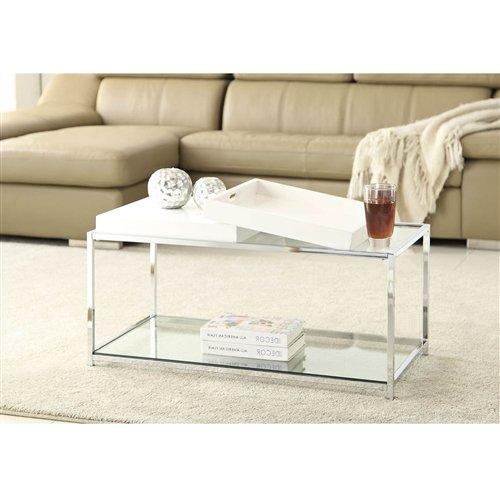 This Modern Chrome Metal Coffee Table with 2 White Removable Trays combines urban design and multi-function use. the palm beach coffee table features two removable white trays that can be reversed to use as a flat surface or as serving trays. clear tempered glass table top allows use of coffee table with or without trays.