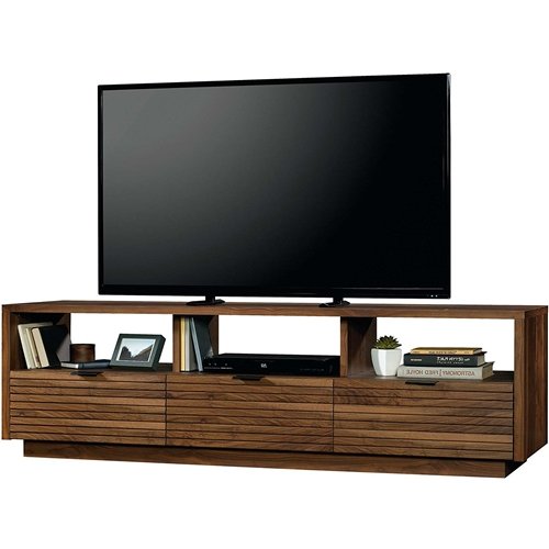 With a classic mid-century modern design and versatile storage options, this 70 in. Entertainment Center Credenza adds sleek style and convenience to any space. This handsome TV Stand is constructed from engineered wood and comes in a warm grand walnut finish that complements any style decor. It features three easy-glide drawers for enclosed storage as well as three open cubby-style shelves for additional storage or room for displaying your favorite decorative accents. This low-profile credenza has a wide surface space, which easily accommodates televisions up to 70 inches. Clean lines and transitional style mean this beautiful credenza complements any style of existing decor.