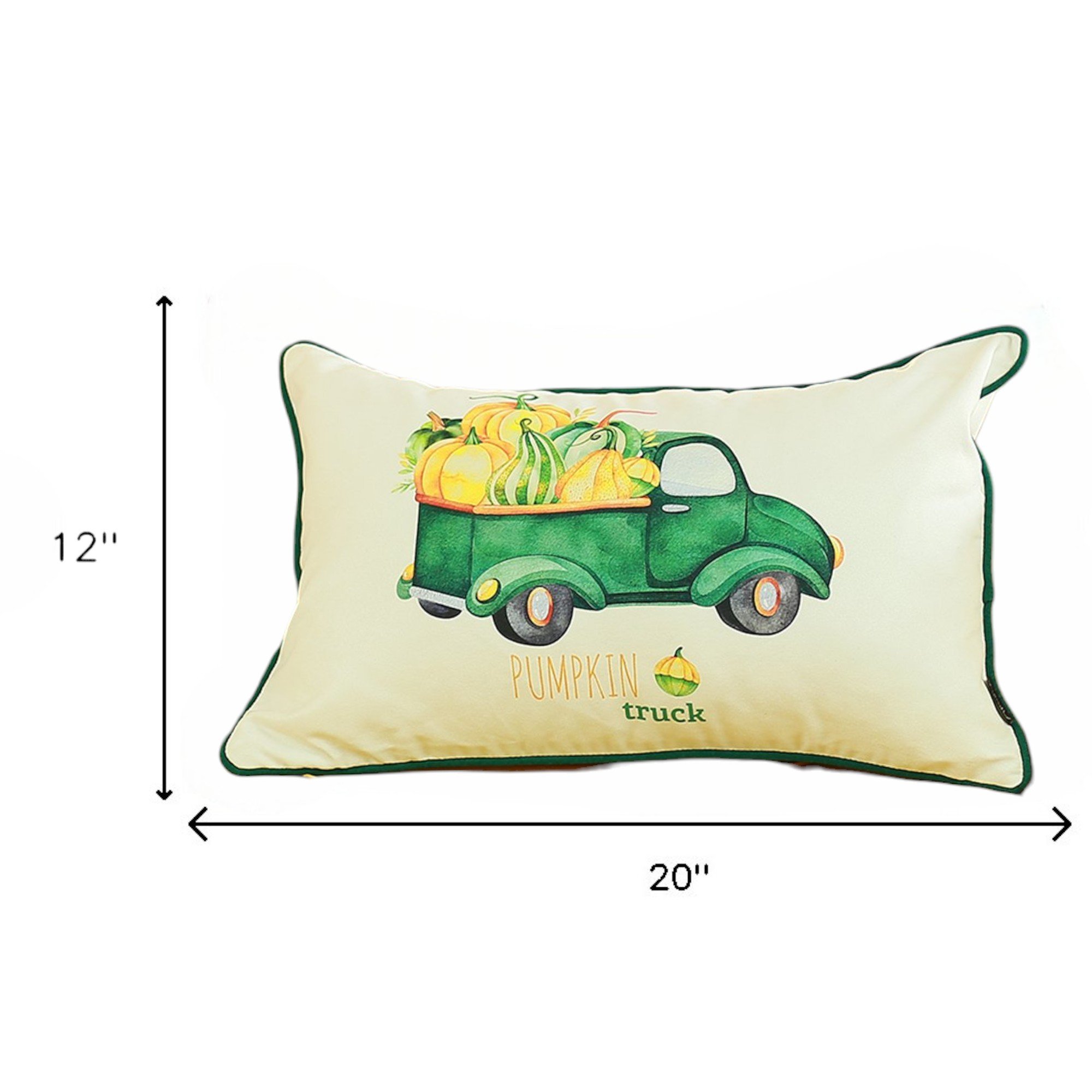 Bring a bit of fashion and zip to your space with this eye-catching and comfy set of two 12-inch x 20-inch green and white pumpkin truck pumpkin fabric lumbar throw pillow covers. This comfy and cozy set of two 12-inch x 20-inch green and white pumpkin truck pumpkin fabric lumbar throw pillow covers is a perfect way to celebrate and decorate for the fall season. These green and white hued pillow covers represent quality construction, expertly made from durable polyester that is not only long lasting but super soft to the touch as well. Emblazoned with the text pumpkin truck these pillows add some visual interest and decor to your space. Emblazoned with the text pumpkin truck these pillow covers add some visual interest and decor to your space. Great to use on its own or mix with other decorations for the perfect look. A great decorative accessory to add color and dimension to your favorite chair, accent your sofa, or to use as part of your bed ensemble. 12-inch h x 20-inch w x 1-inch d.