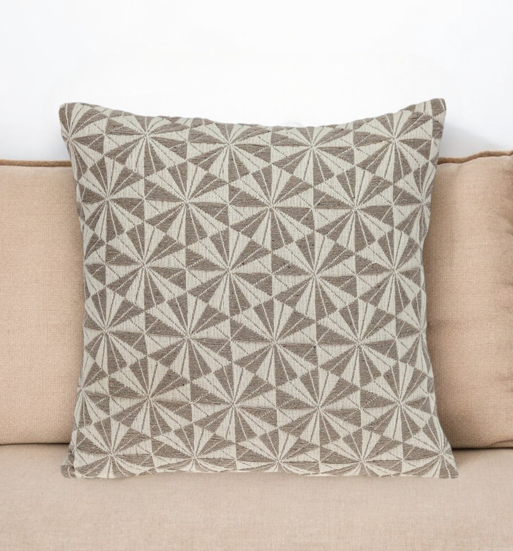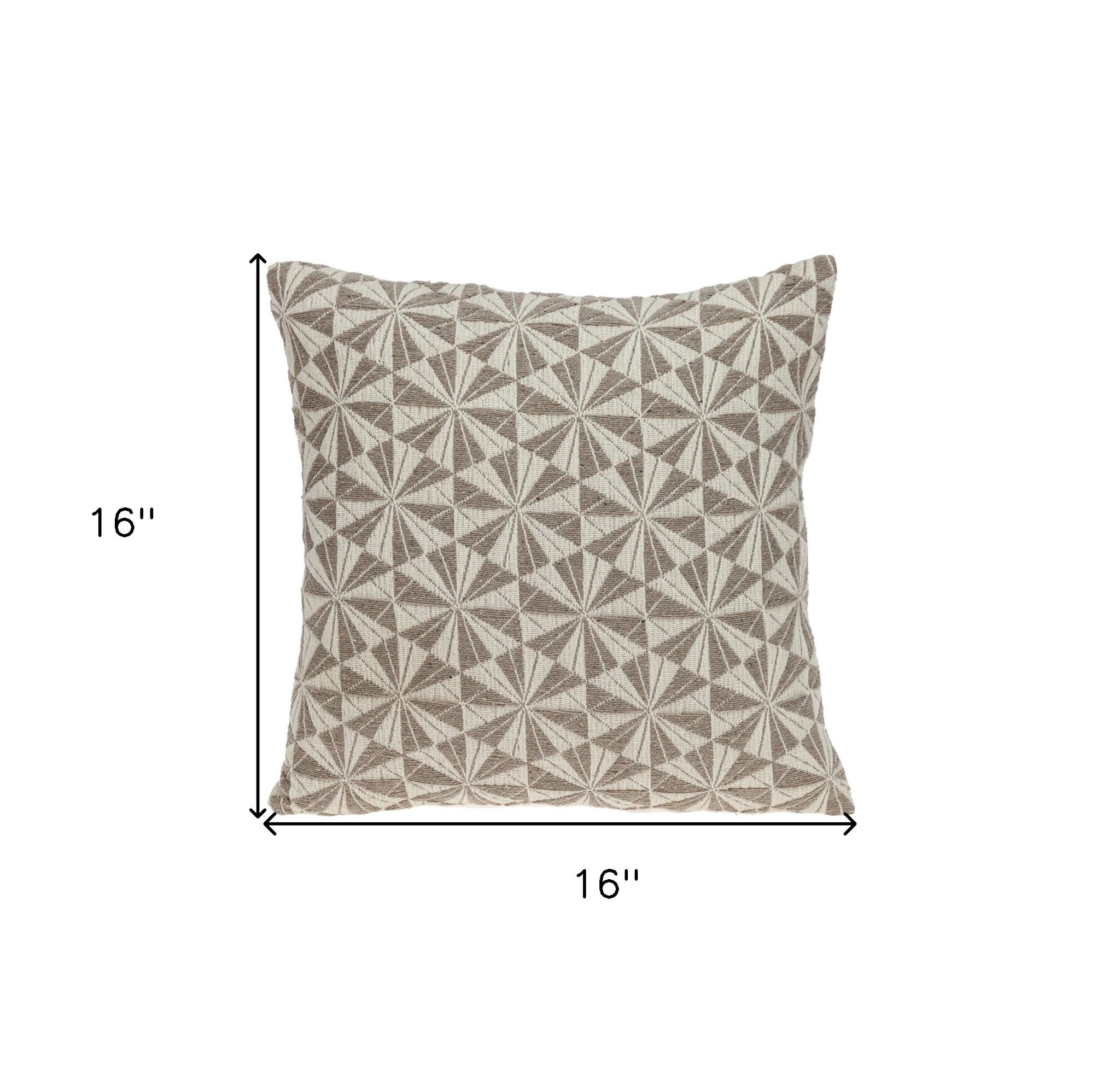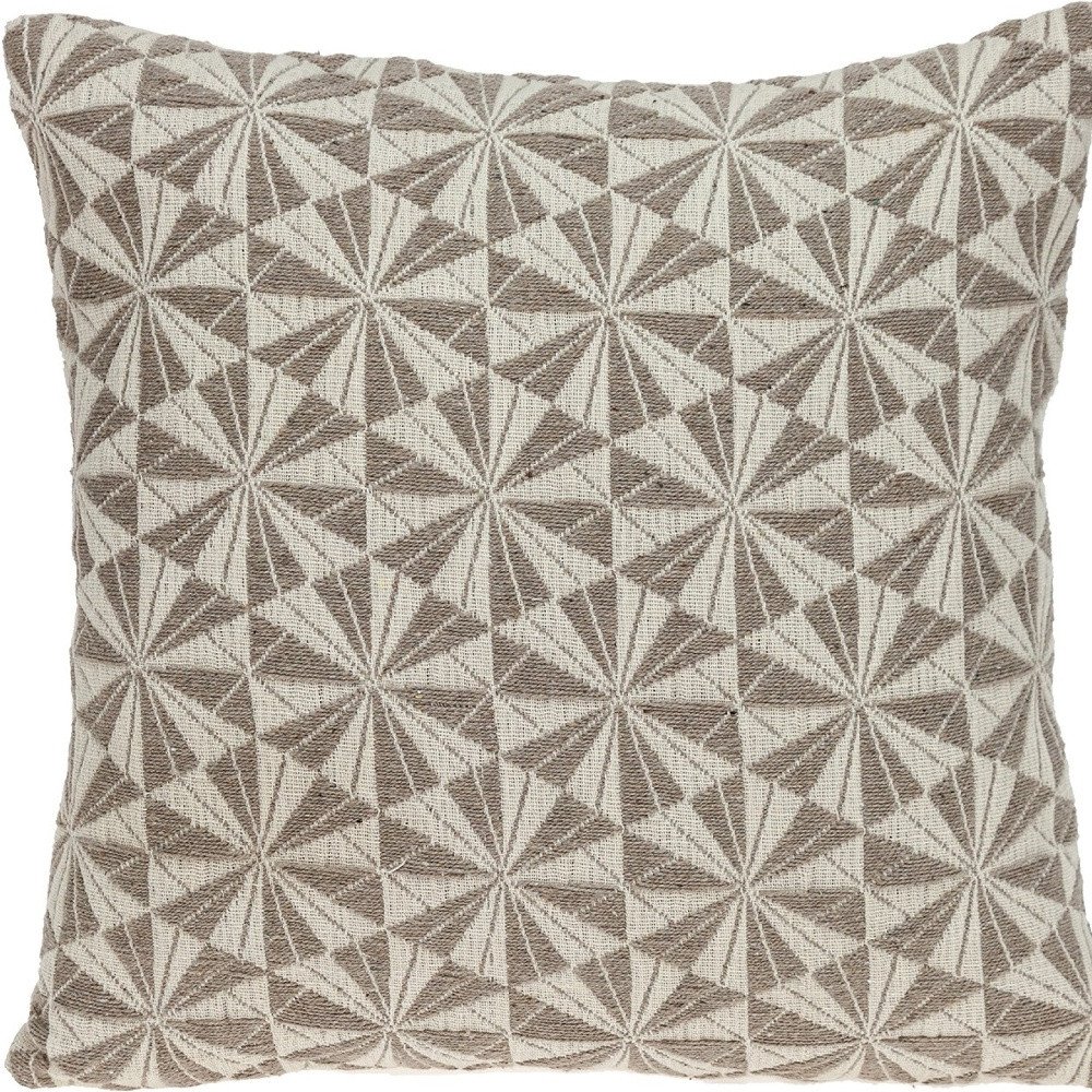 A simple throw pillow can make any bland living space interesting and attractive, and this Pale Brown Pinwheels Throw Pillow does an excellent job in doing the same. The embroidered geometric pattern in mocha beautifies the beige background of the pillow, making it a great addition to any dark-colored armchair, accent chair, couch, or any other furniture. This fluffy decorative pillow is 100% cotton and has solid beige canvas and convenient zipper closure on the back. 16" x 16" x 5"