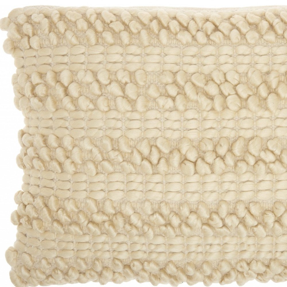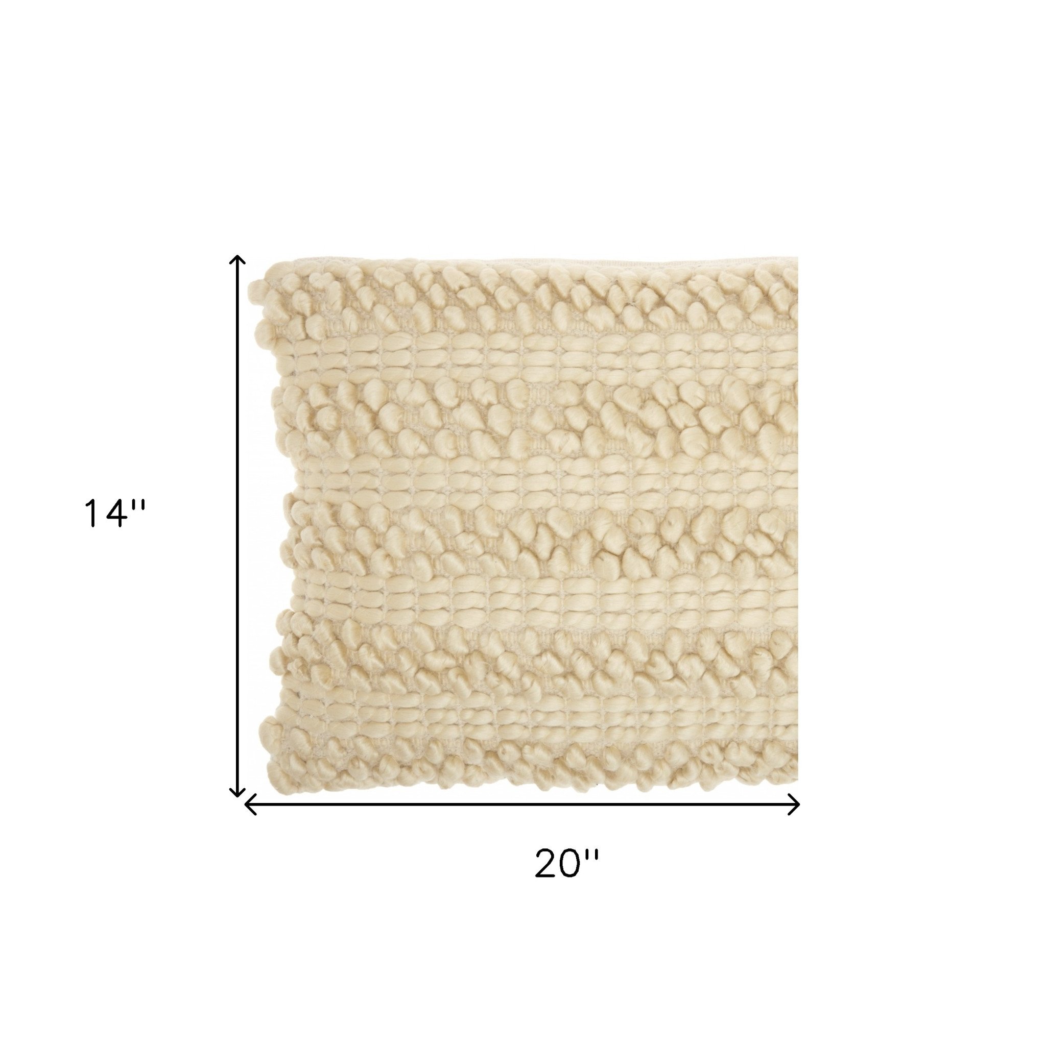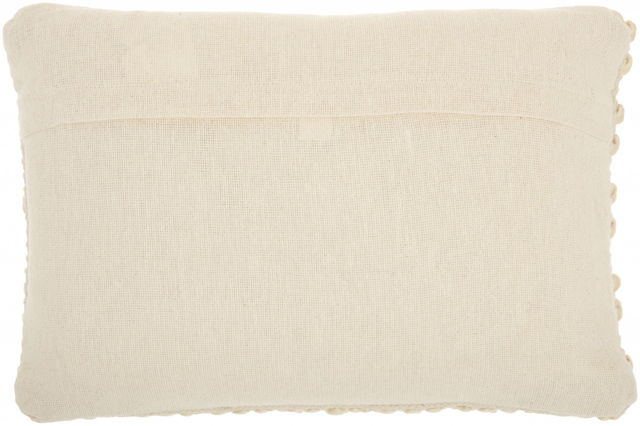 Add a touch of unique design and comfort to any seating space in your home with this Cream Pom-Pom Detailed Lumbar Pillow. This pillow has a rectangular shape with a hidden zip closure at the back for a seamless look. The cover is covered in a cream colored fabric which has a striped design on top of it. There are two designs in the stripes with one stripe with an embroidered pattern and one stripe with a textured small pop-pom pattern. These stripes alternate and give a very textured feel to the pillow. You can use this pillow anywhere in your home and it will work with any existing colors or decor style you already have, You can use this pillow to elevate the look of your bed, your couch, or your favorite chair. This lumbar pillow also provides excellent back support. 5" H x 14" W x 20" D