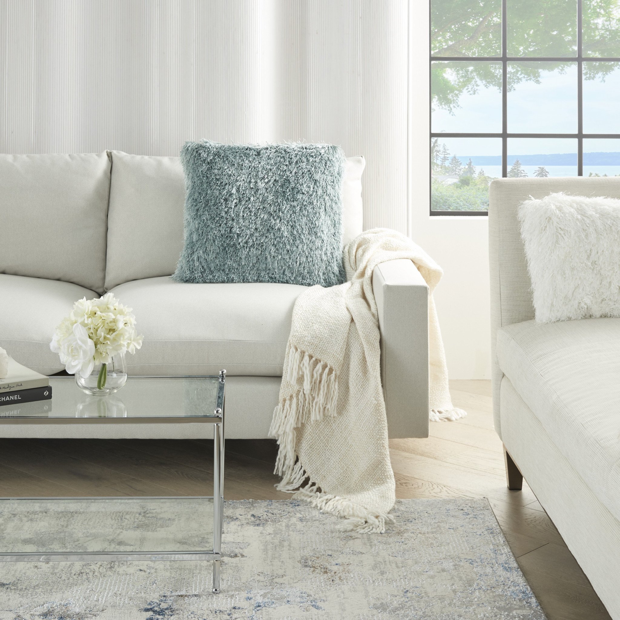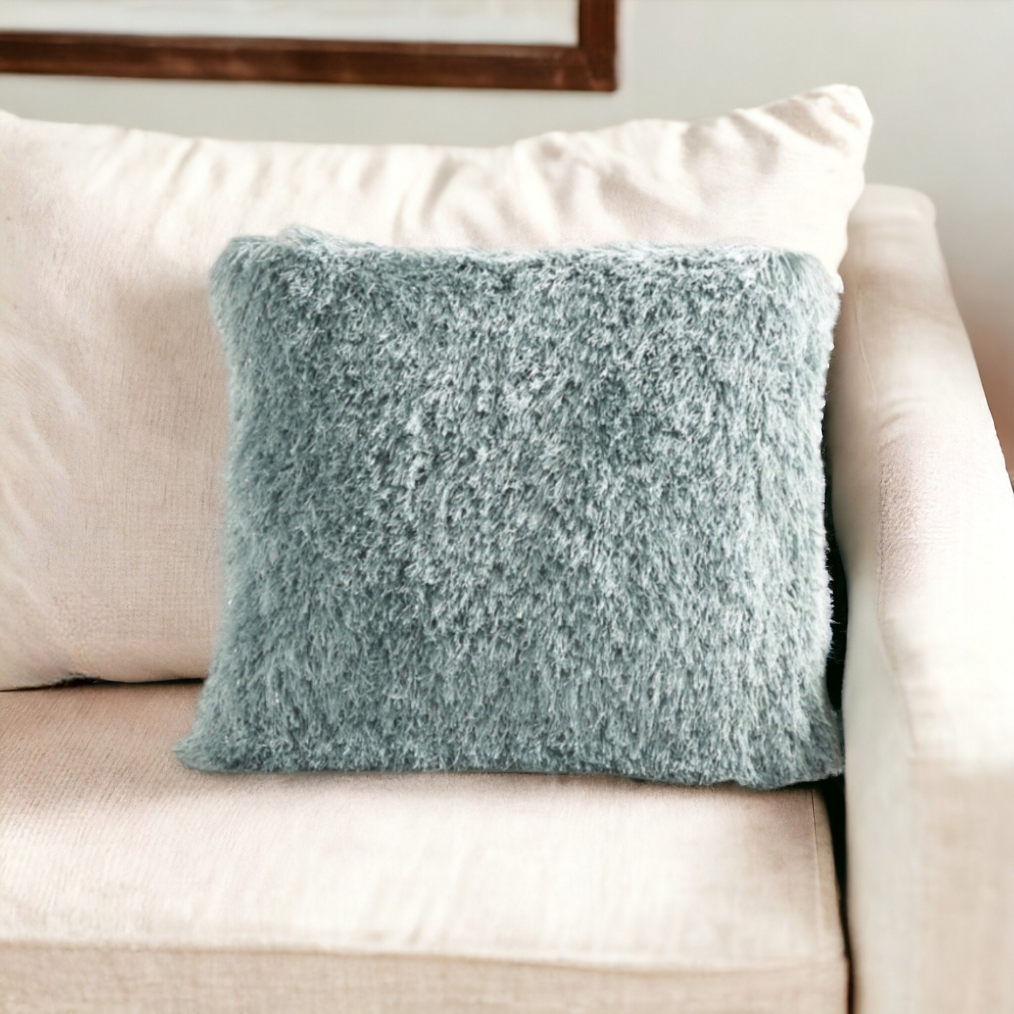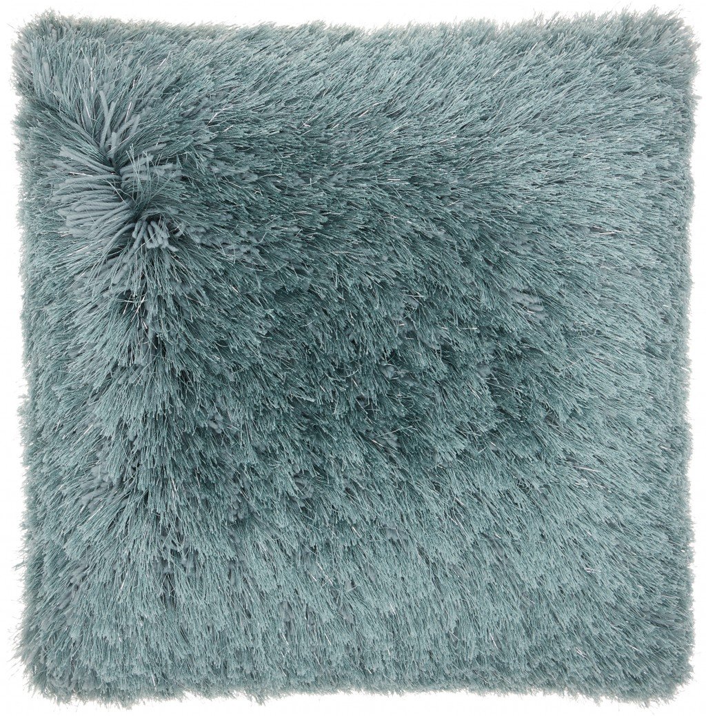 Add luxusiously soft texture and some fresh modern looks to your space with this Green Metallic Yarn Super Shag Throw Pillow. The celadon green metallic yarn on this textural pillow is chic and super cozy soft. Add this decorative pillow to your favorite chair, sofa, or bed for a comfortable yet fresh and modern accent