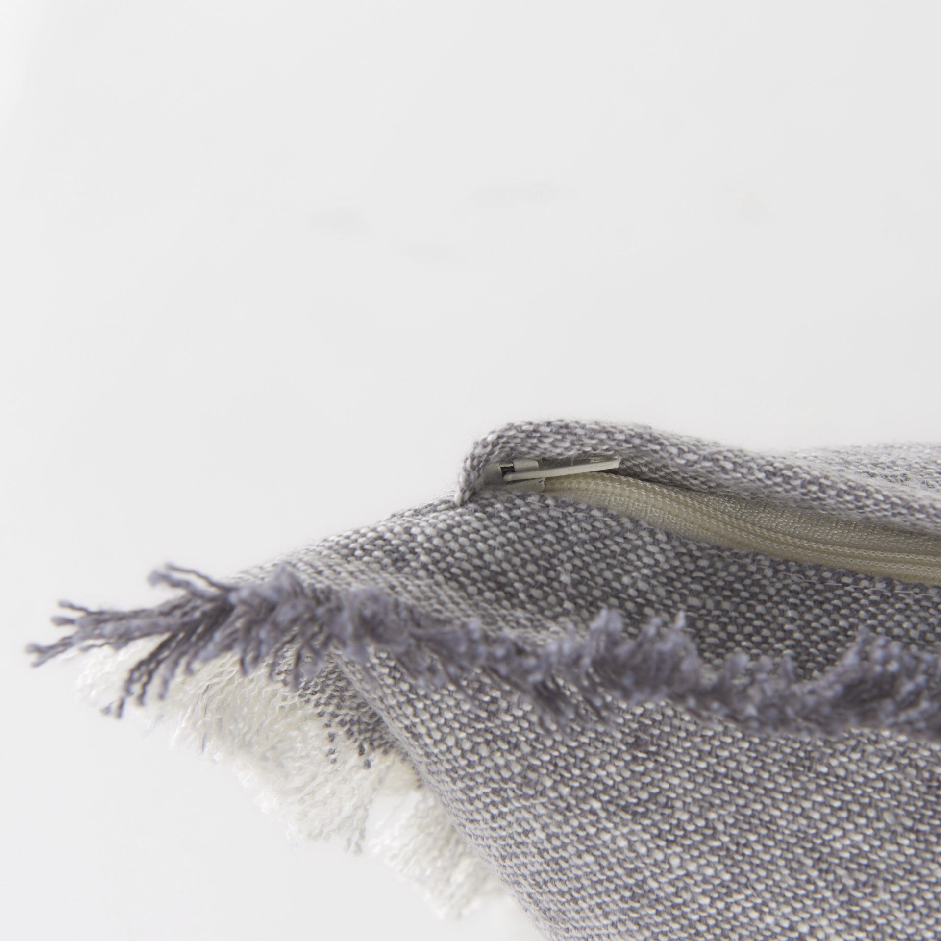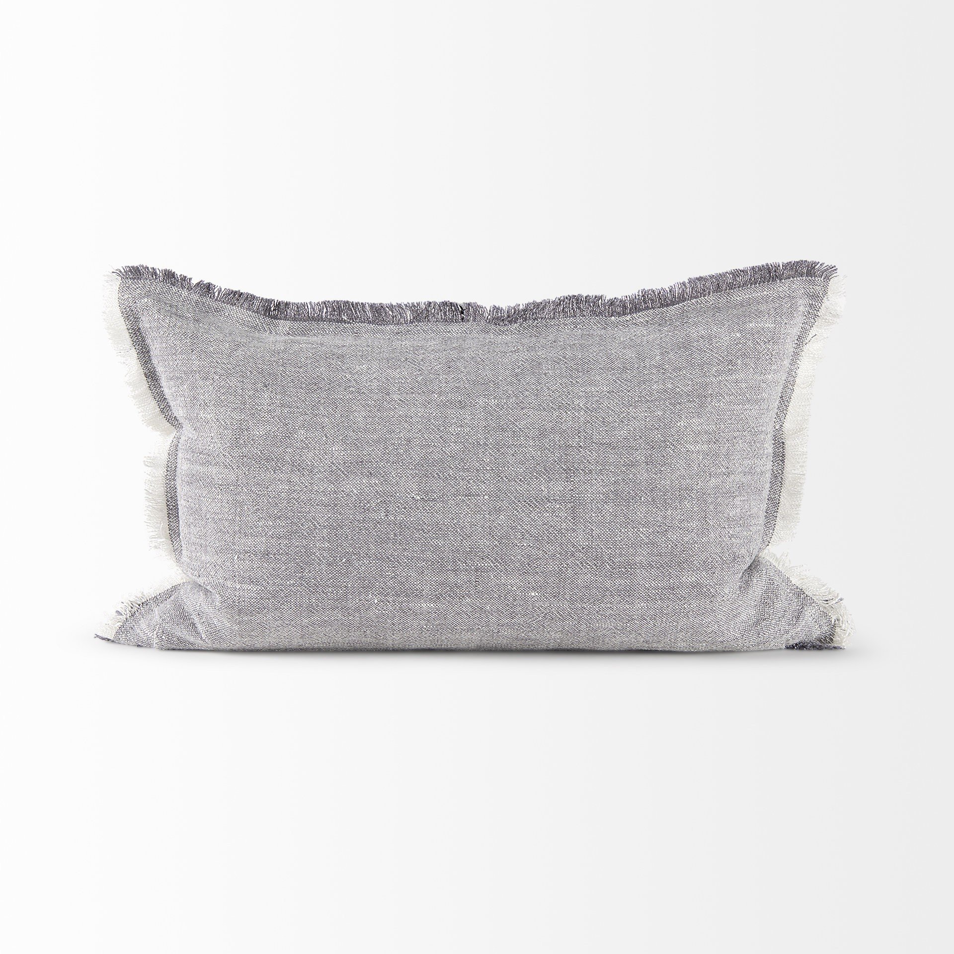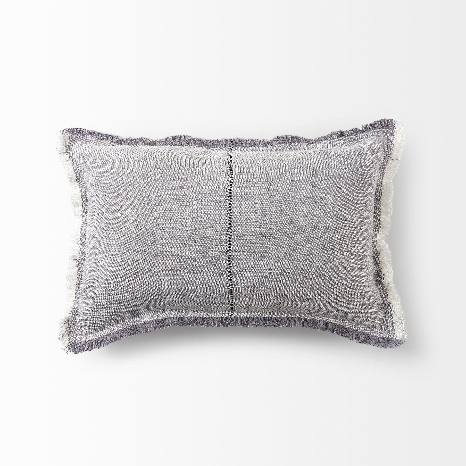 With this Light Gray Fringed Lumbar Throw Pillow Cover you can add the perfect finishing touch to your couch. This Throw Pillow Cover is made highly durable and soft linen material that provides comfort beyond measure. The light gray background of this Throw Pillow Cover has a stonewash feel to it. There is square stitched detail in the middle of this cover while all four edges have fringed detailing. The top and bottom have gray fringe while the sides have a white colored fringe. The back has a zip closure that ensures your cushion stays in there securely. The neutral color palette will look great on top of any couch, bed or chair you have and go with any interior style you have in your home. This Throw Pillow Cover is also great for extra back support. 13" H x 21" W x 1" D