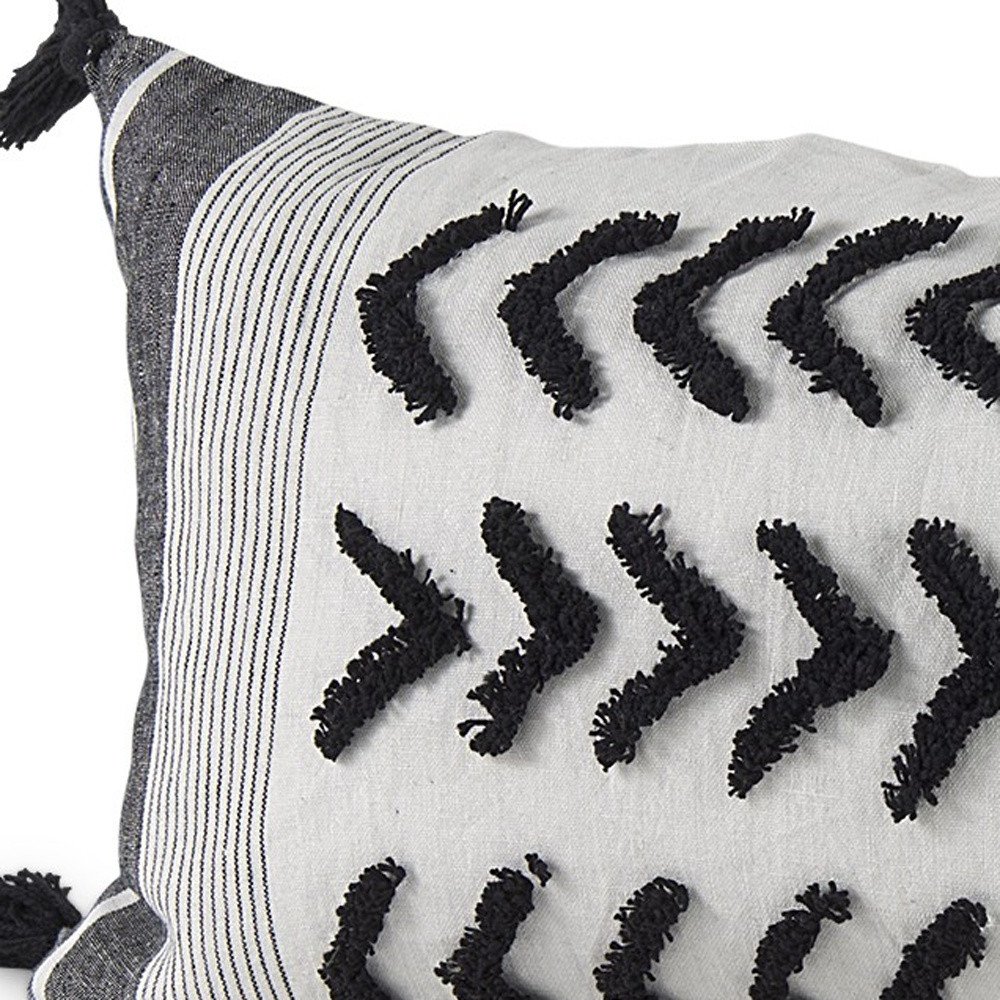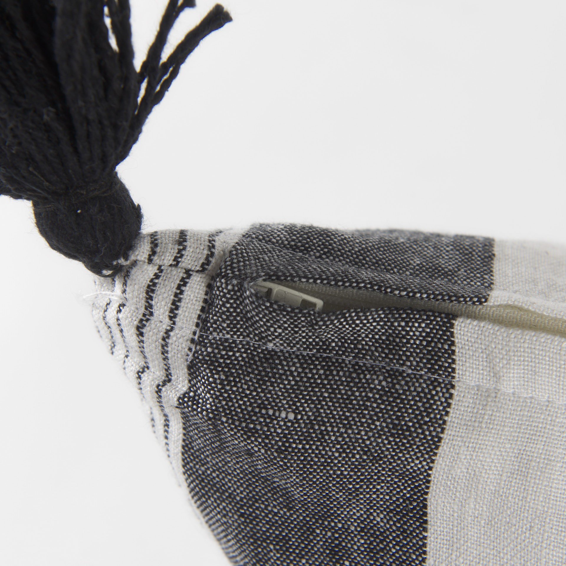 With this White and Gray Fringed Lumbar Pillow Cover you can add the perfect finishing touch to your couch. This Pillow cover is made highly durable and soft linen material that provides comfort beyond measure. The Pillow cover has a white background with gray and striped vertical lines on either edge. On top of the white background there is a black textured chevron pattern which matches the black tassles on all four corners. The back has a zip closure that ensures your Pillow stays in there securely. The neutral color palette will look great on top of any couch, bed or chair you have and go with any interior style you have in your home. This Pillow cover is also great for extra back support. 1" H x 26" W x 14" D