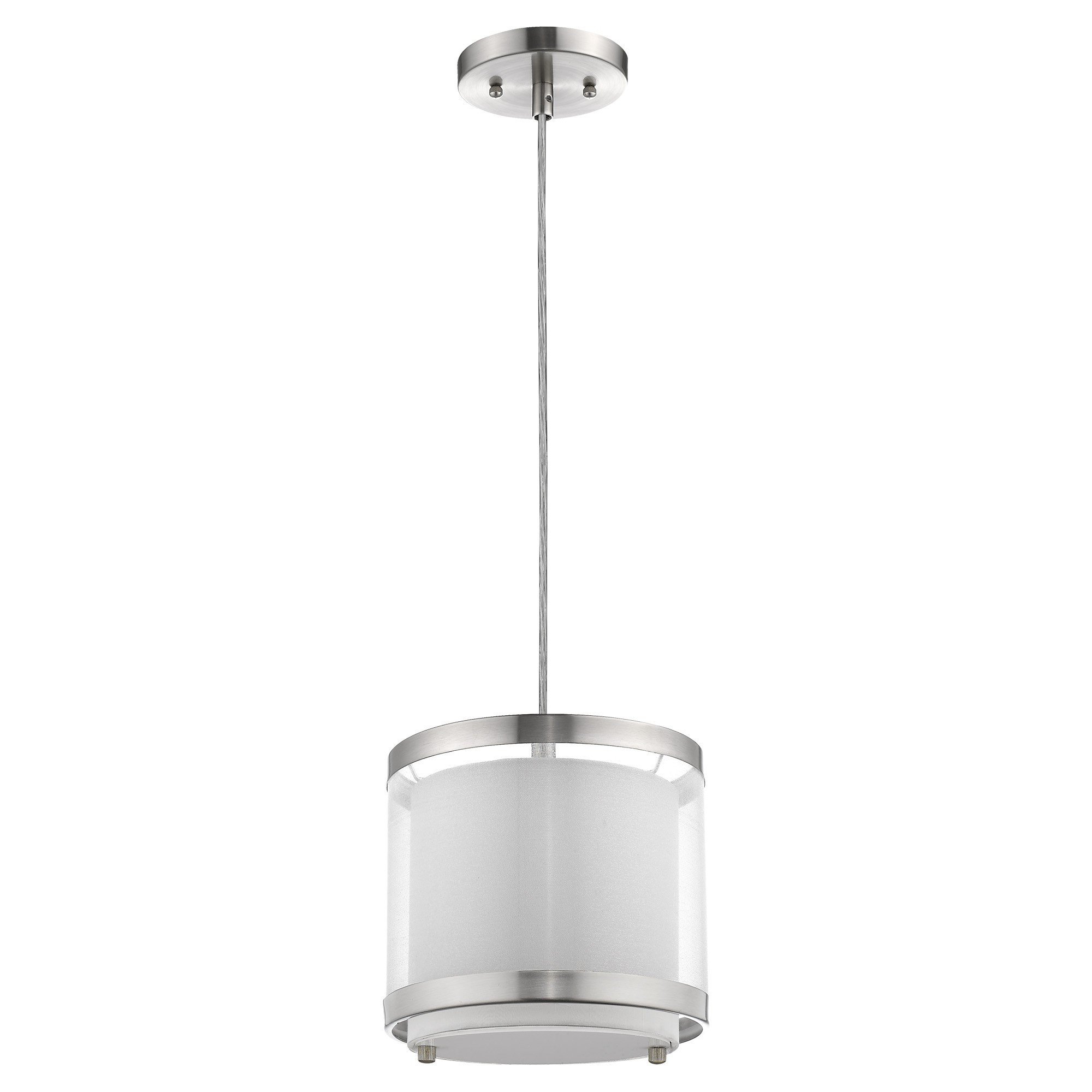 With this White and Silver Hanging Light with Fabric Shade you can update the look of any space in your home while adding brightness to the whole room. The ceiling bracket is made of a solid circular metal piece which is colored to a shiny silver finish. Attached to the bracket is a silver colored wire which is then attached to the bulb holder in the middle. The lampshade has thin silver metal top and bottom borders. The outer fabric shade has a see-through white colored covering while the inside has an opaque bright white covering. This hanging lamp will look great in your living room, your bedroom, or even your entryway. 8" H x 8" W x 8" D