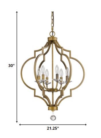 Shed a new light on your space with this illuminating gold and white candle style six light metal dimmable chandelier. This light will require hardwiring installation. This fabulous hanging light is a great way to add some design and brightness to any space in your home. 30-inch H x 21.25-inch W x 21.25-inch D