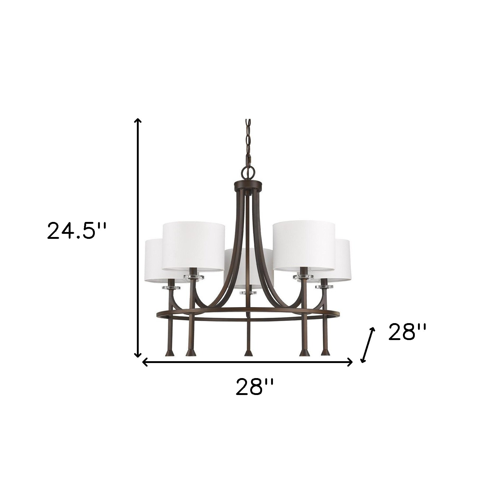 This beautiful brown candle style five light crystal metal dimmable chandelier with white shades will brighten up and change the look of your room. This light will require hardwiring installation. This fabulous hanging light is a great way to add some design and brightness to any space in your home. 24.5-inch H x 28-inch W x 28-inch D