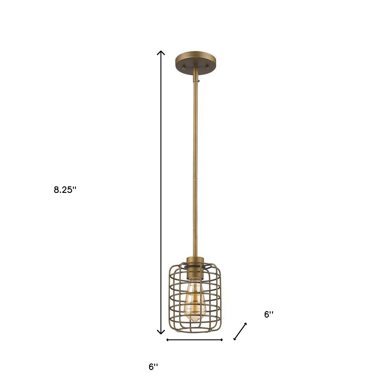 Upgrade your lighting fixtures with this Brushed Gold Metal Cage Hanging Light. This stunning hanging light has a round metal bracket which has a thin metal rod attached to it. The metal rod is then attached to the bulb holder. The hardware is colored to a brushed gold finish. The shade of the light has a rounded cylindrical shape and is made of thin metal wires which give this light a very industrial look. The finish on the cage shade is in a darker brushed gold shade. This hanging light will look great as an accent light fixture in your living room, your dining area, or even on top of your kitchen island. 8.25" H x 6" W x 6" D