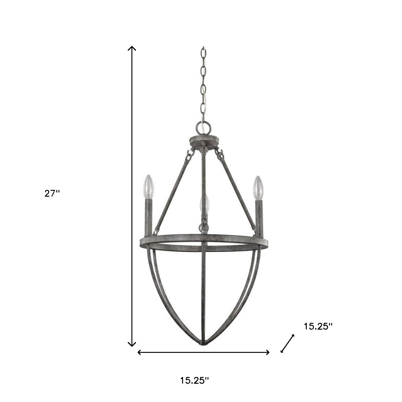 This beautiful ash gray candle style three light metal dimmable chandelier will brighten up and change the look of your room. This light will require hardwiring installation. This fabulous hanging light is a great way to add some design and brightness to any space in your home. 27-inch H x 15.25-inch W x 15.25-inch D