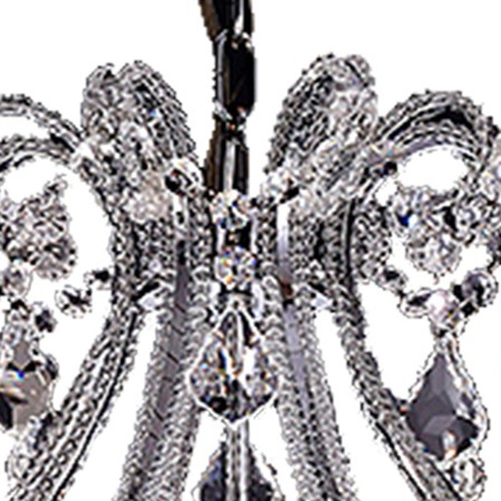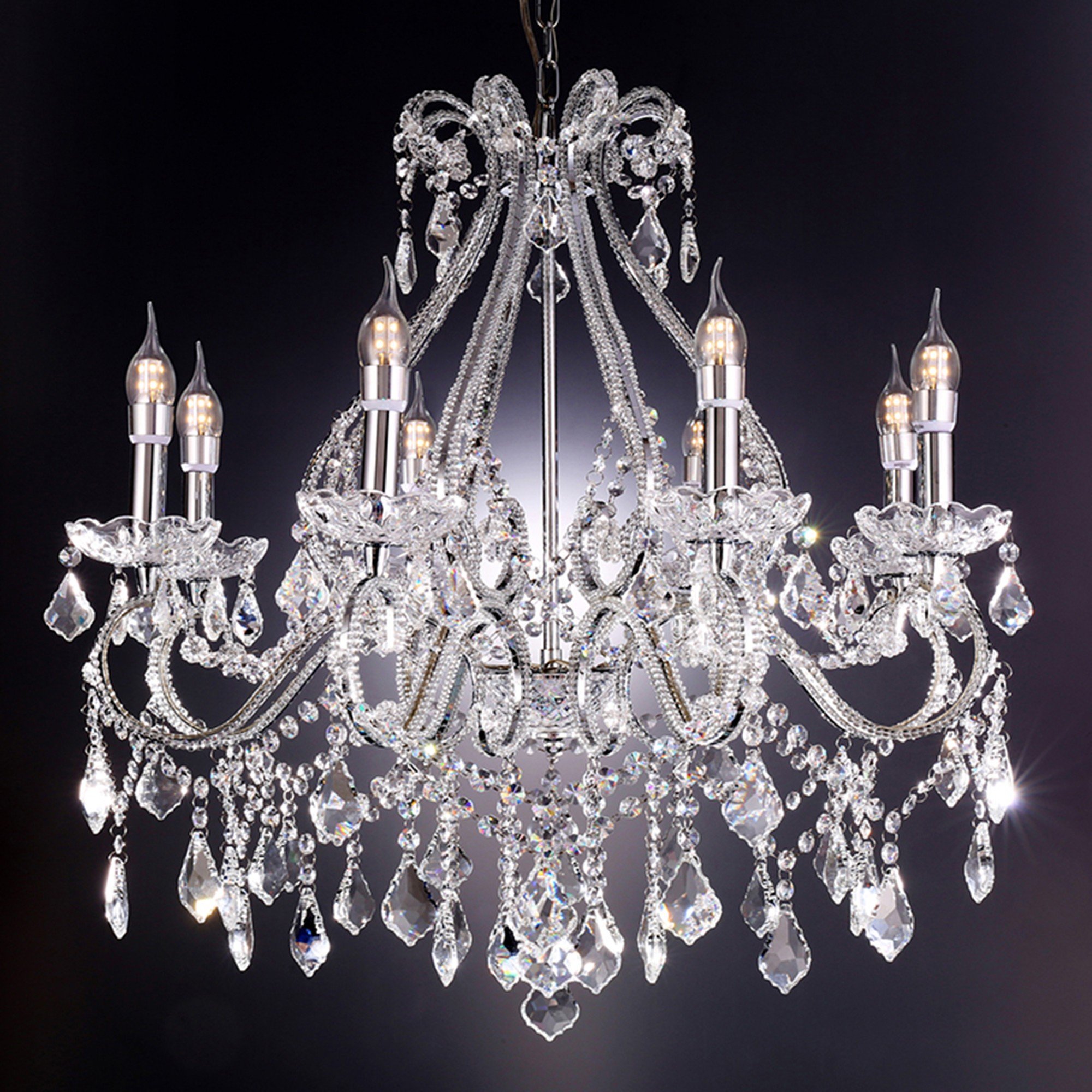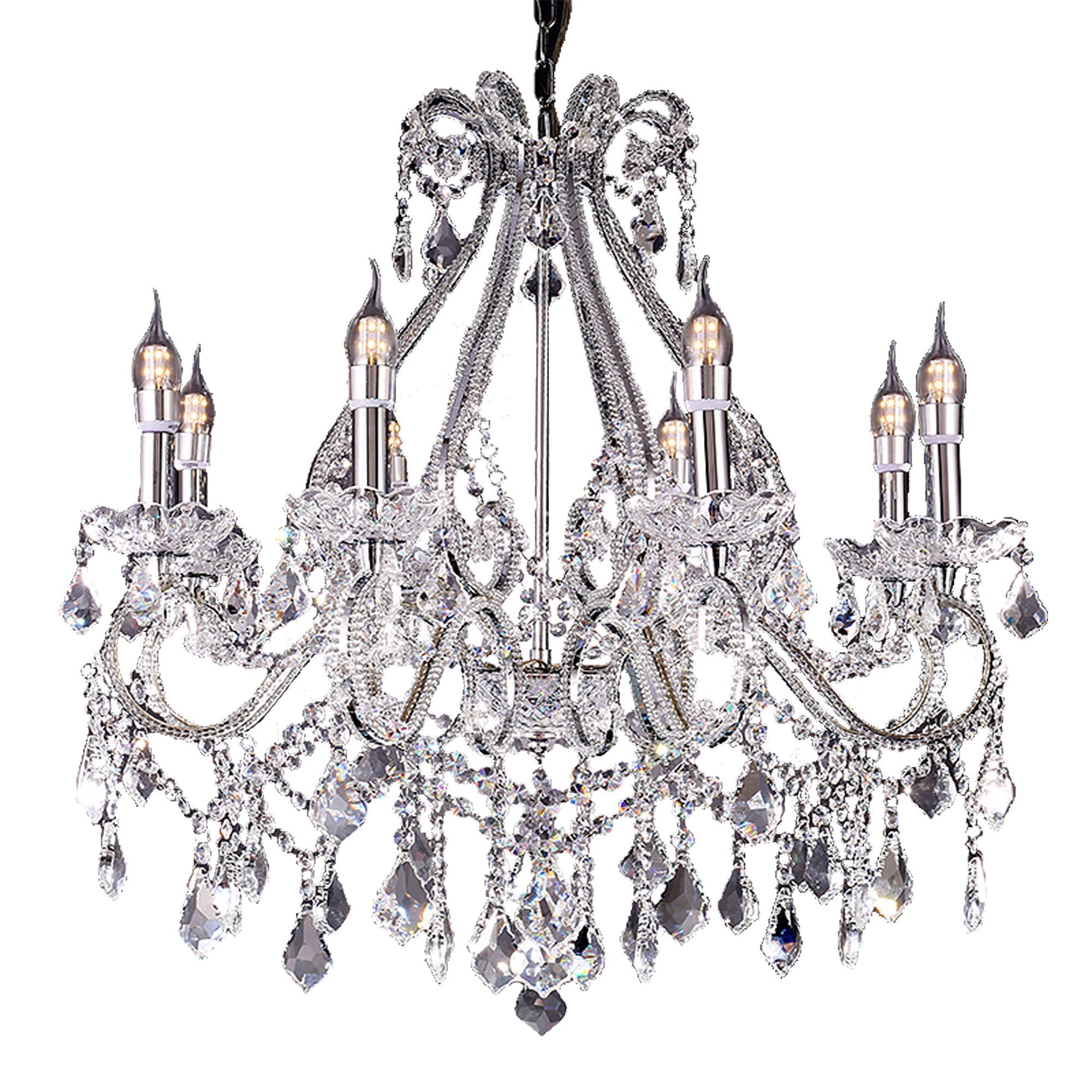 Dress up your entryway, dining room, kitchen, or bedroom with this candle style empire eight light transparent glass LED ceiling light. Get creative and change up the look of any room from Hallway, to Closet, to Office or Bedroom with this gorgeous hanging chandelier light fixture. 28-inch H x 26-inch W x 26-inch D