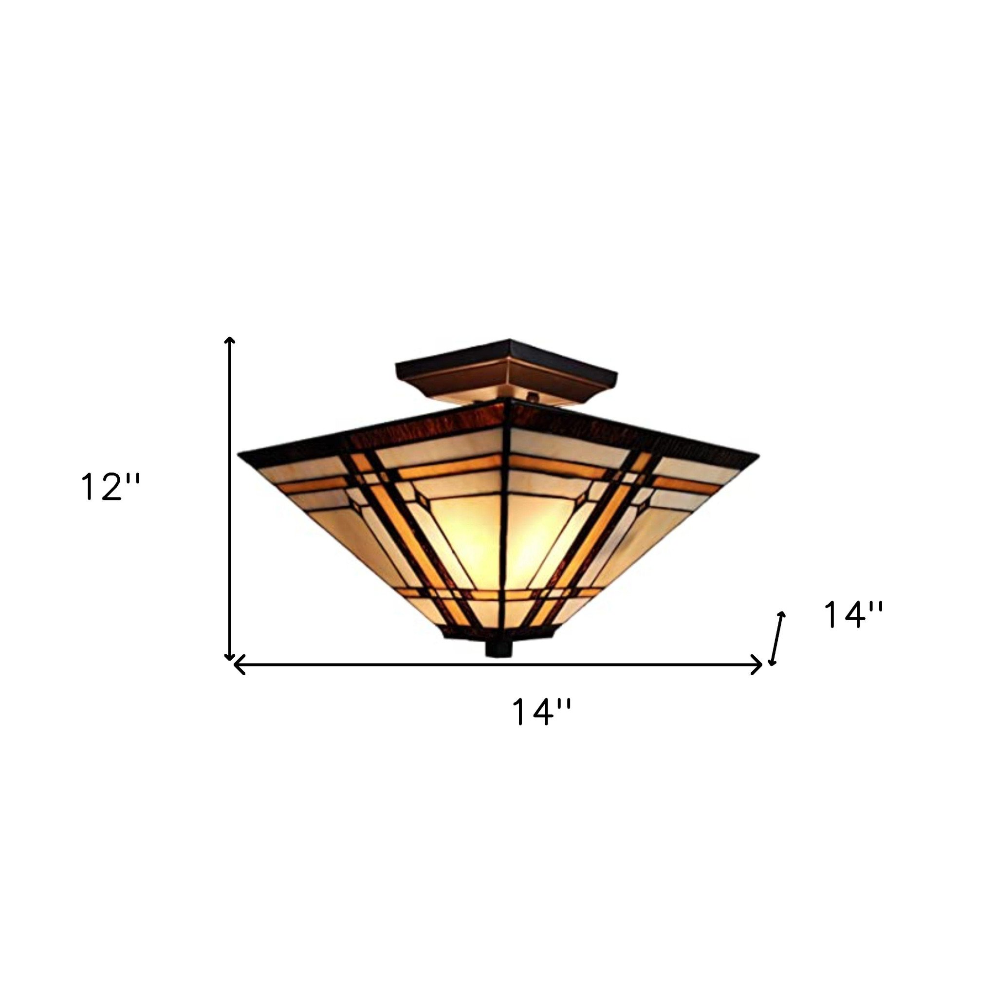 This beautiful brown and amber tiffany style mission semi flush dimmable ceiling light will brighten up and change the look of your room. This light will require hardwiring installation. This fabulous hanging light is a great way to add some design and brightness to any space in your home. 12" H x 14" W x 14" D