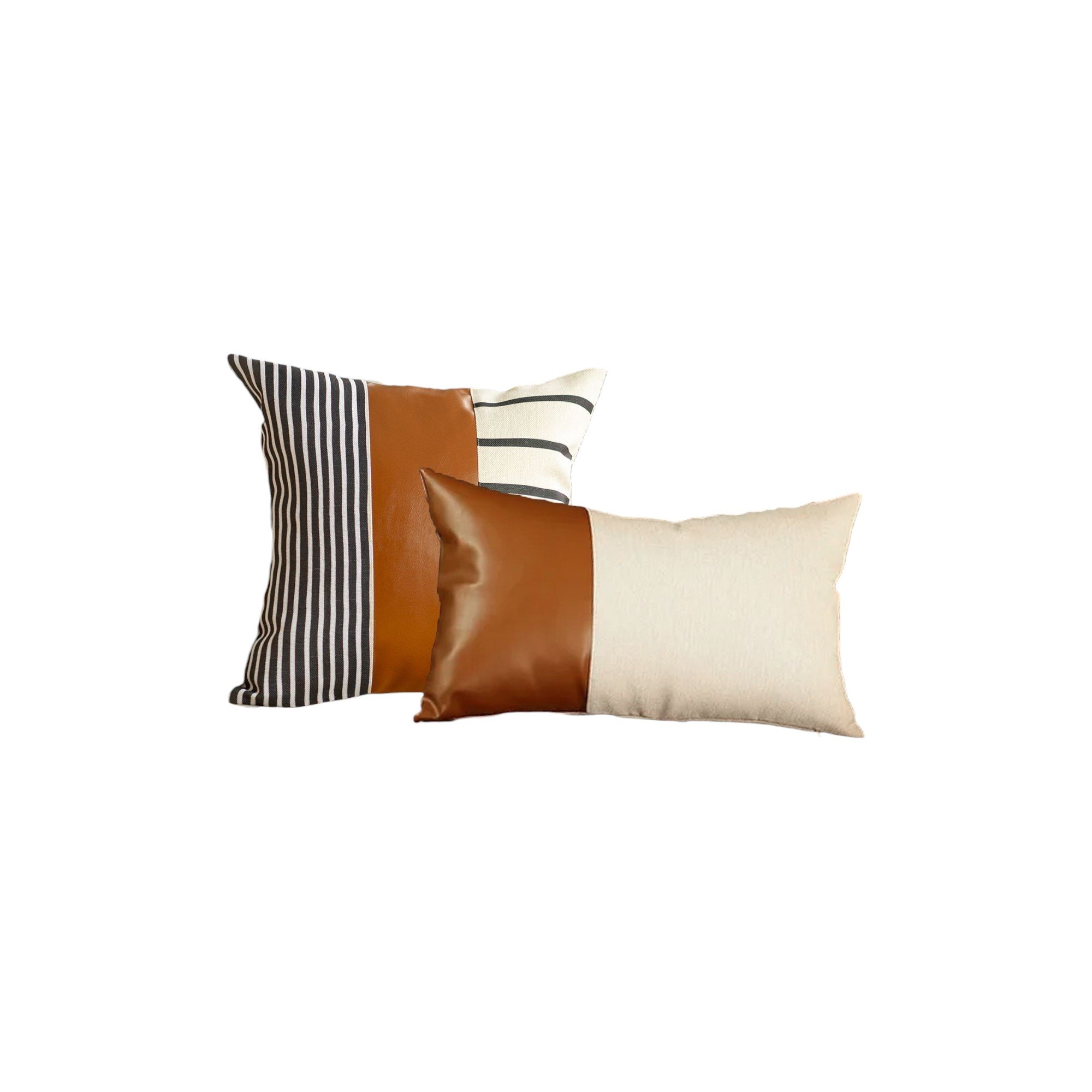 Home > Set of Two Beige Brown and Black Geometric Fabric and Faux Leather Throw Pillow Covers