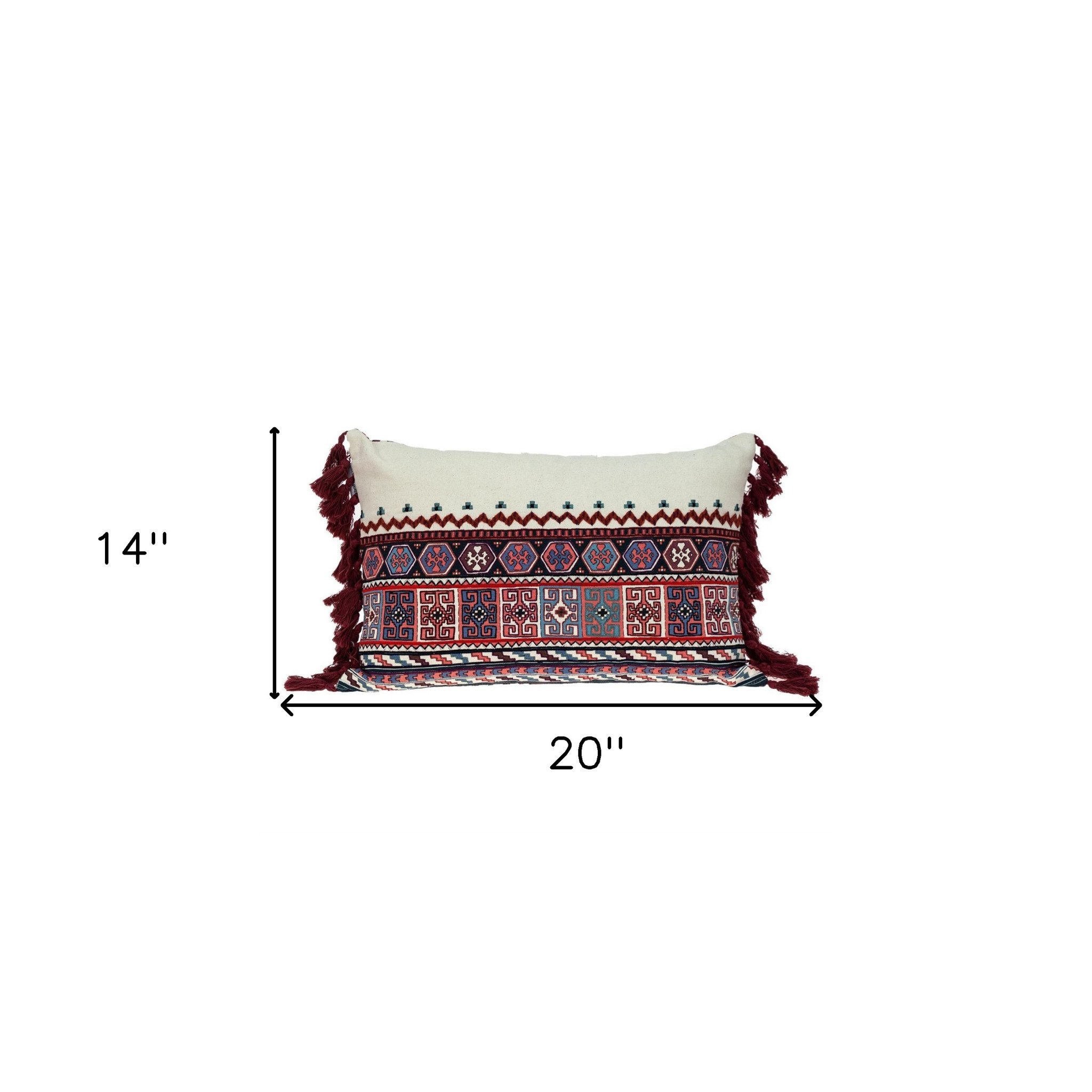Home > 14" X 20" Blue Burgundy And Cream Abstract Cotton Blend Throw Pillow with Tassels