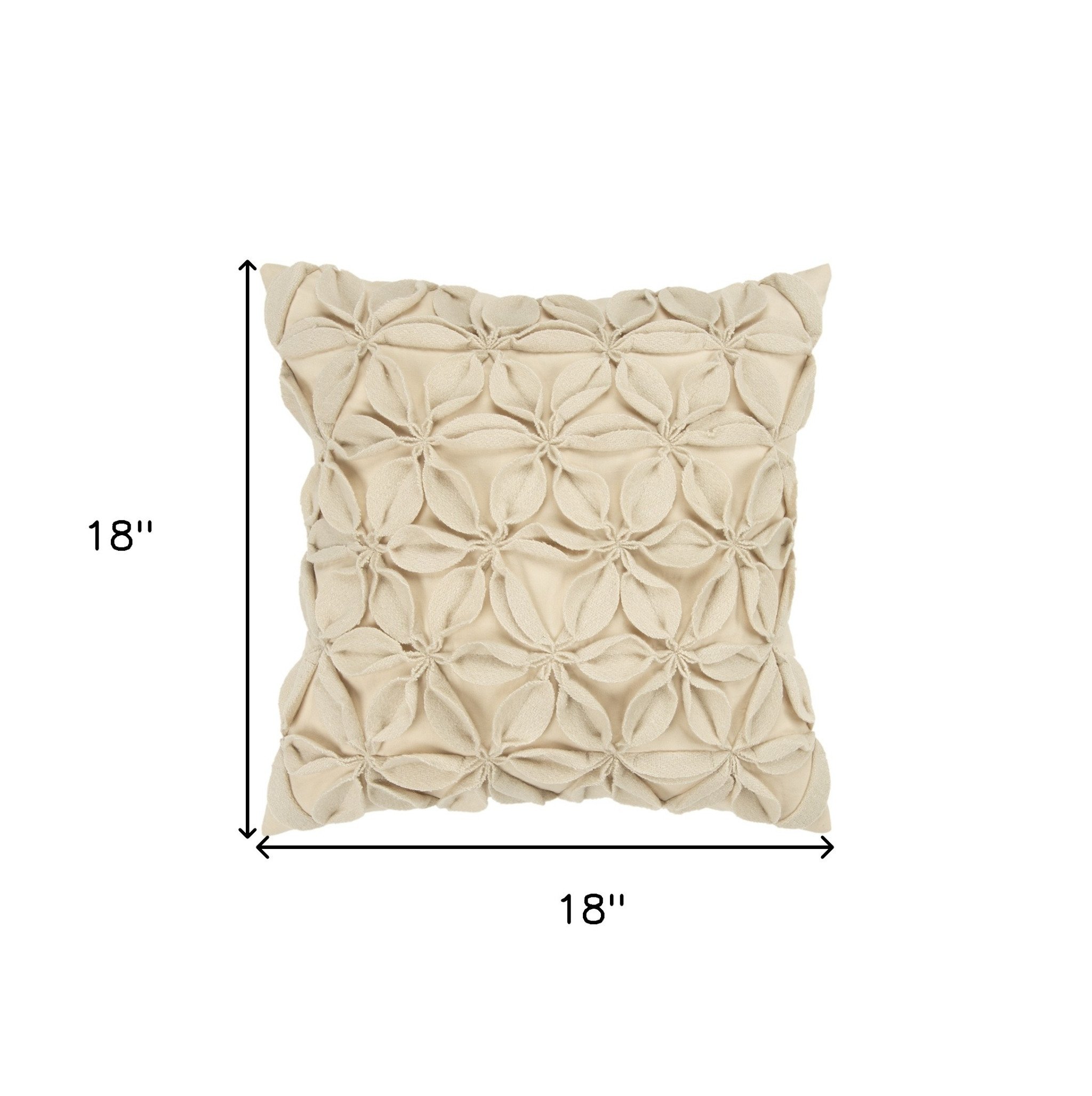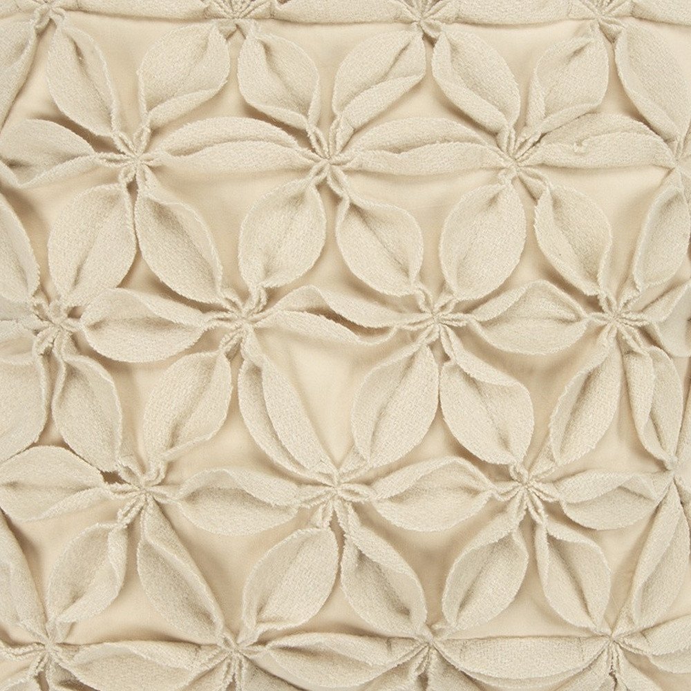 The visually intriguing texture of this Cream Pinwheel Floral Petal Throw Pillow will undeniably serve as an eye-catching accent in your living space. The pinwheel floral work is skillfully crafted in cream-white tone with intricate machine-stitched detailing on the wool felt petals to keep the shape intact for added dimension to the piece. Ideal for adorning any modern or contemporary home, this pillow is crafted from cotton fabric to ensure a soft hand with long-lasting durability. The solid coordinating back features a concealed zipper closure for ease of washing while the knife edge caters to a clean and sophisticated look. Meant to work well with various genres, this heavily textured throw pillow will set an inviting tone in the room without compromising style and comfort. 18" x 18" x 6.25"