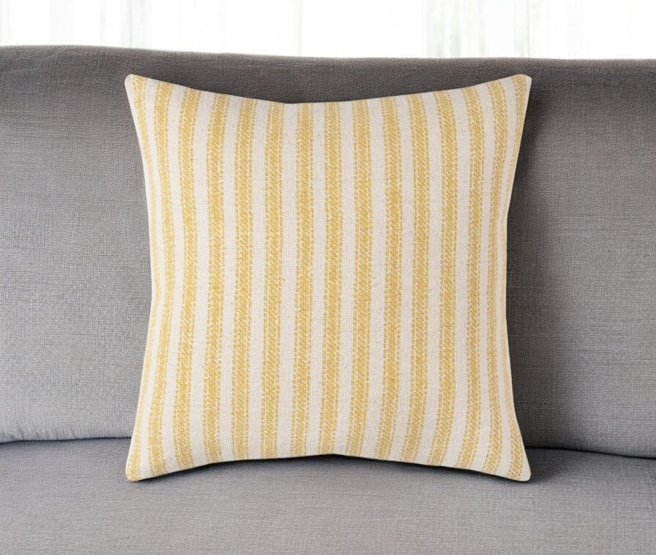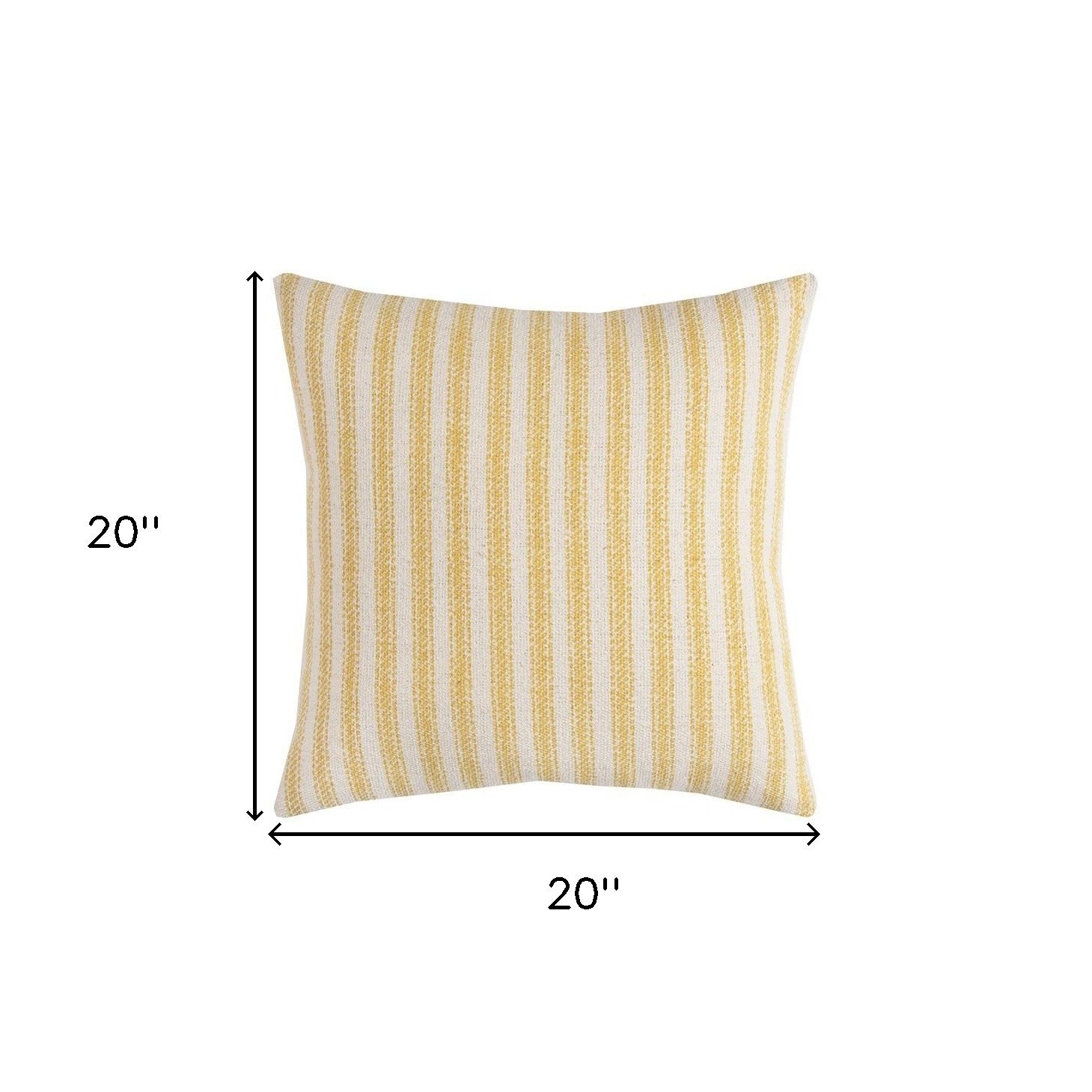 Unique and decorative, this comfortable 20-inch yellow and natural ticking stripe cotton canvas throw pillow will leave a lasting impression. This natural and yellow colored decorative pillow is made from high grade canvas textured cotton that is durable and long lasting. Super soft and built to hold its shape, this polyester-filled pillow is a great option. A great decorative accessory to add color and dimension to your favorite chair, accent your sofa, or to use as part of your bed ensemble. 20-inch h x 20-inch w x 6.25-inch d.