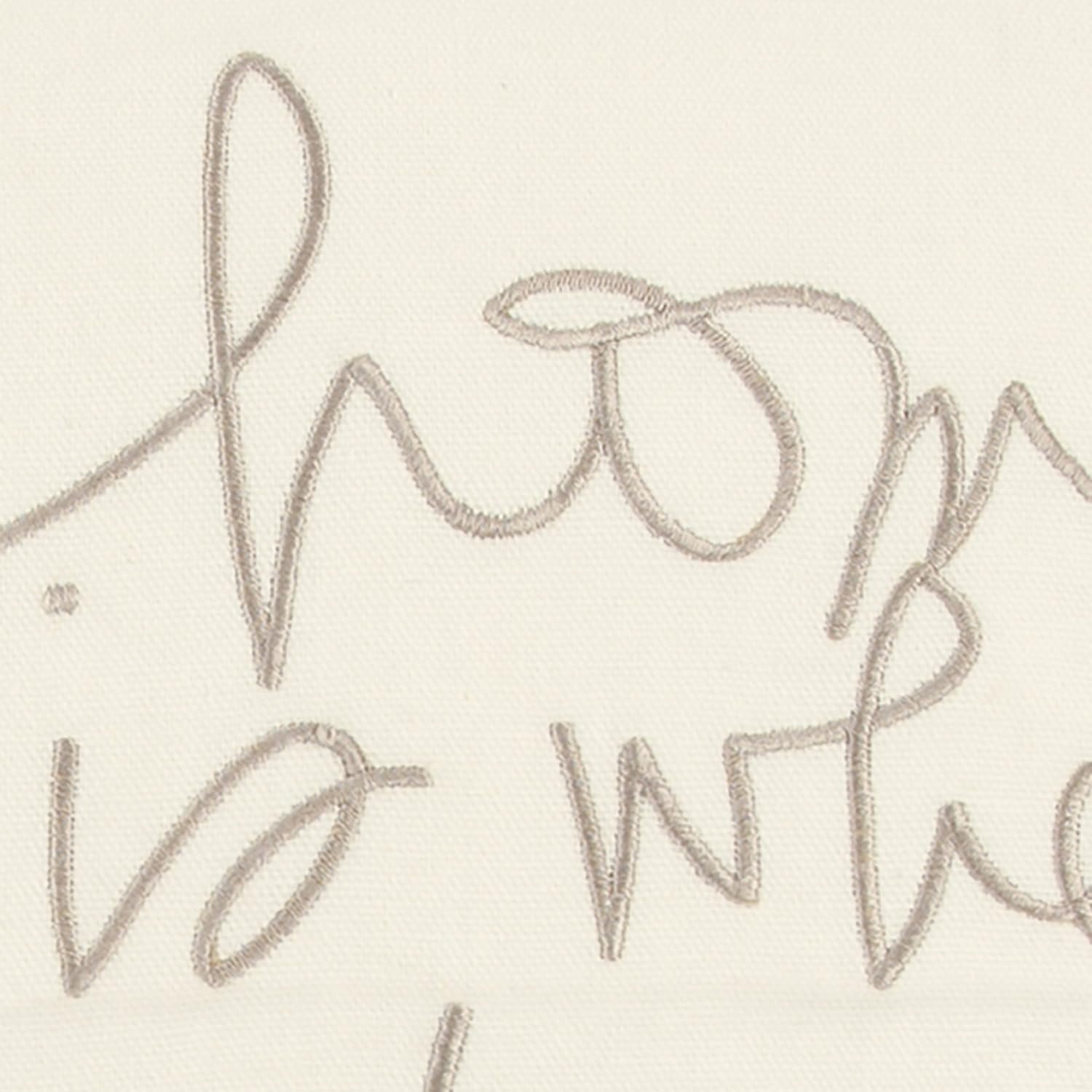 Bring a rustic yet trendy touch-up to your household with this Ivory and Jute Home is Where the Heart Is Lumbar Pillow. This pillow features an embroidered shadowy underprint of " home is where the heart is" in a lovely font while strands of woven jute make a heart pattern secured with a dimensional flat cotton cord bow for visual intrigue. Add style and dimension to your modern or traditional home with this artisanal pillow on the bed, sofa, or couch. 21" x 11" x 6.25"