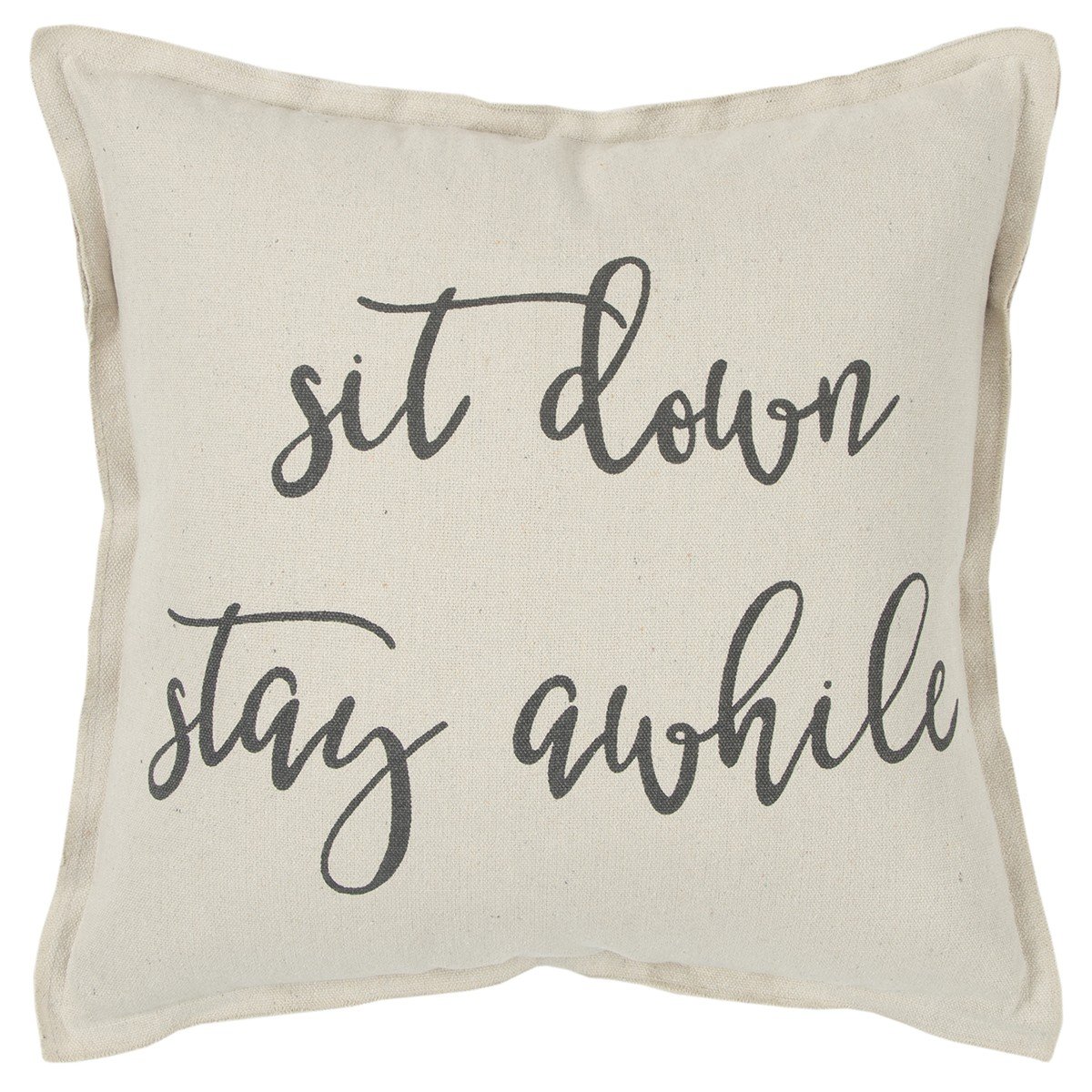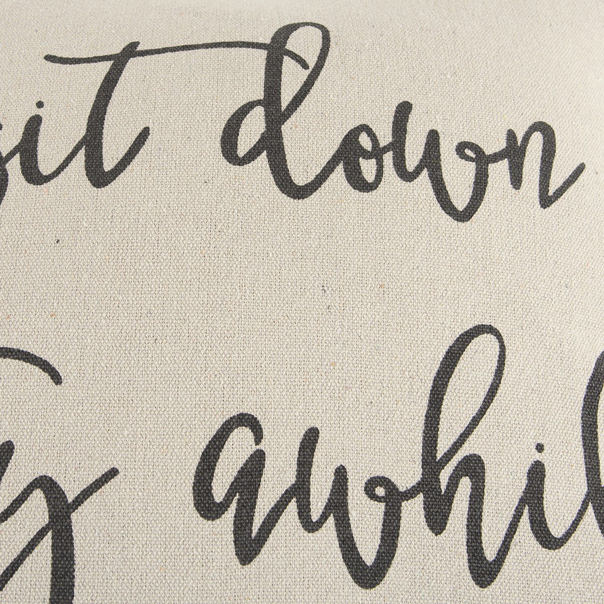 Bring a relaxing vibe into your modern home with this simple yet stylish Gray Cream Stay Awhile Decorative Throw Pillow on the sofa or couch. Featuring a whimsical expression that says "sit down stay awhile" in a pretty cursive font, the pillow exudes an emotional and inviting vibe while giving a light texture to the piece. The soft and neutral hues of the pillow with the thoughtful verbiage make it an ideal accent piece to add a modern flair to your living space. The embroidered flange edges are meant to prevent fraying and lend a sophisticated look to the pillow. The solid coordinating back features a hidden zipper closure for ease of fill and cleaning. Bring a sense of character into your contemporary home with this decorative throw pillow in the room. 20" x 20" x 6.25"