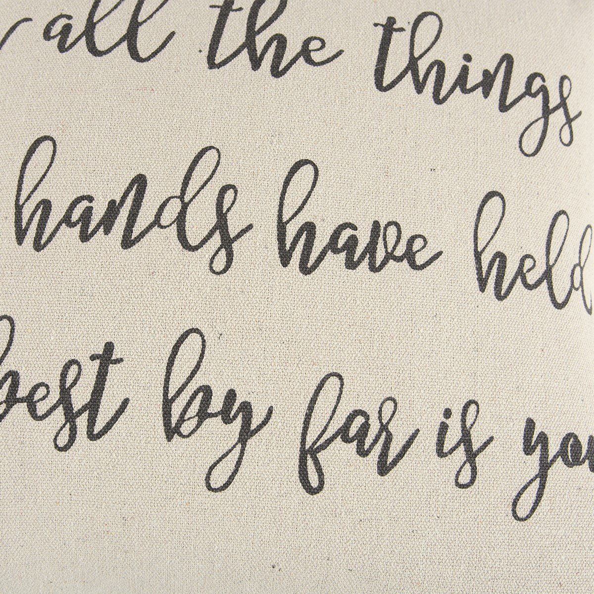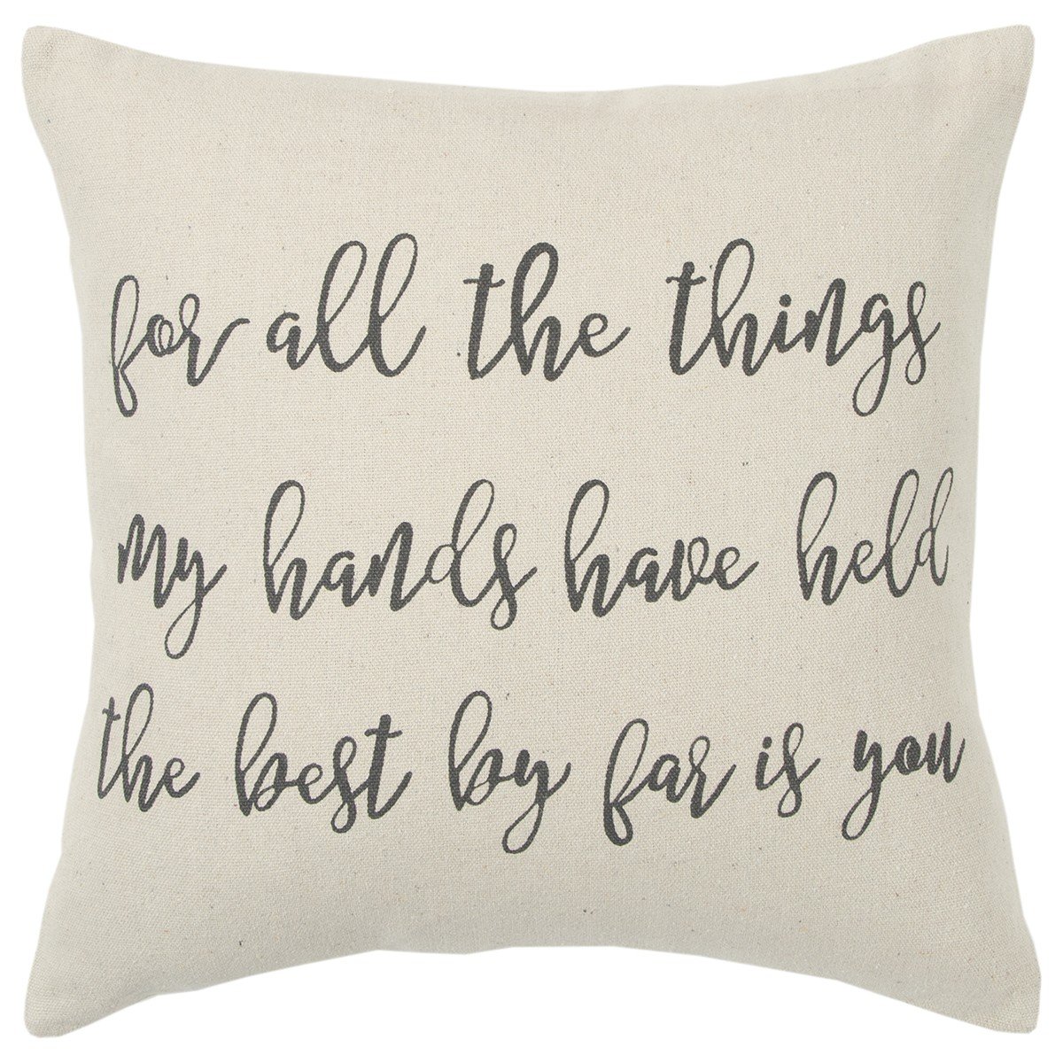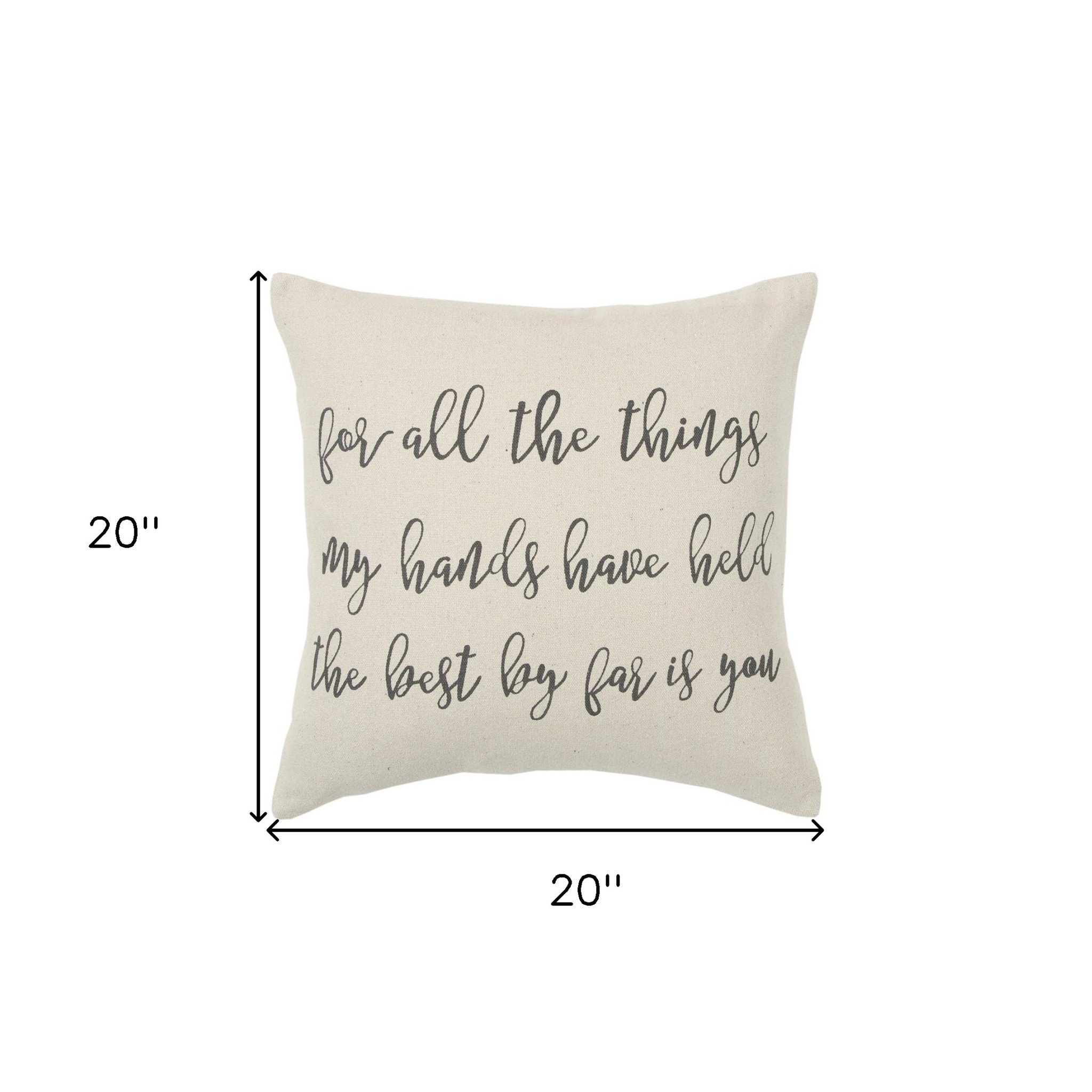 Embracing a modern color palette with utmost simplicity, this Gray Taupe All The Things Throw Pillow will perfectly work well with any bright or bold-toned decors. The playful romantic sentiment stating 'for all the things my hands have held the best by far is you' is written in a cursive gray font over a cream-colored base for a classy appearance. The light texture of the cotton fabric gives a luxurious feel on the tough while the knife edging ensures a clean look with crisp corners for a modern appeal. The back of the pillow is in a solid color as the front and features a hidden zipper closure, making the poly-filled pillow easy to clean and maintain. This decorative throw pillow will be a sophisticated addition to enhance your casual décor with a stylish edge. 20" x 20" x 6.25"