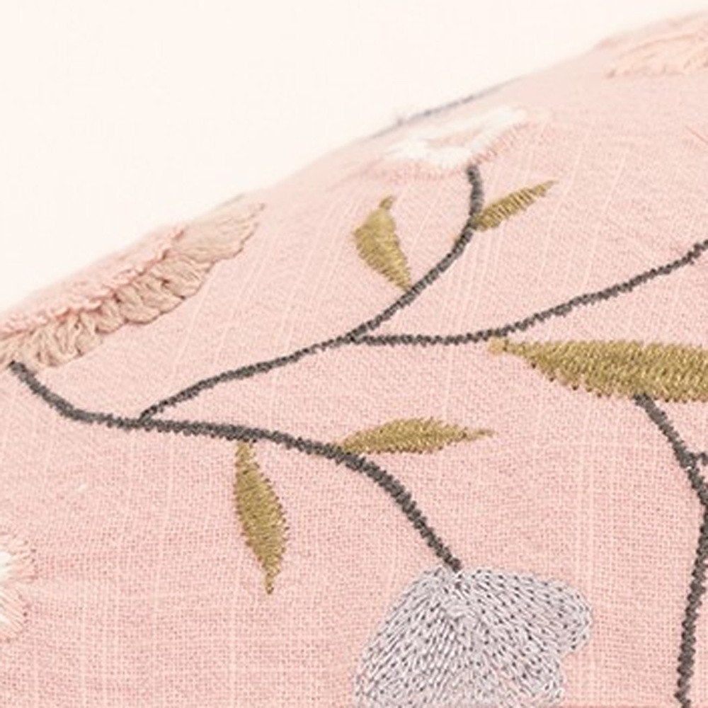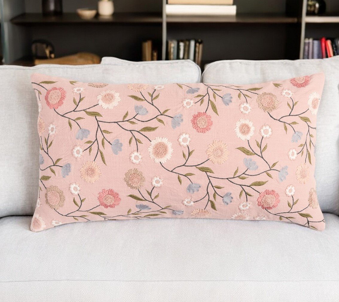 14" X 26" Blush Floral Cotton Throw Pillow With Embroidery