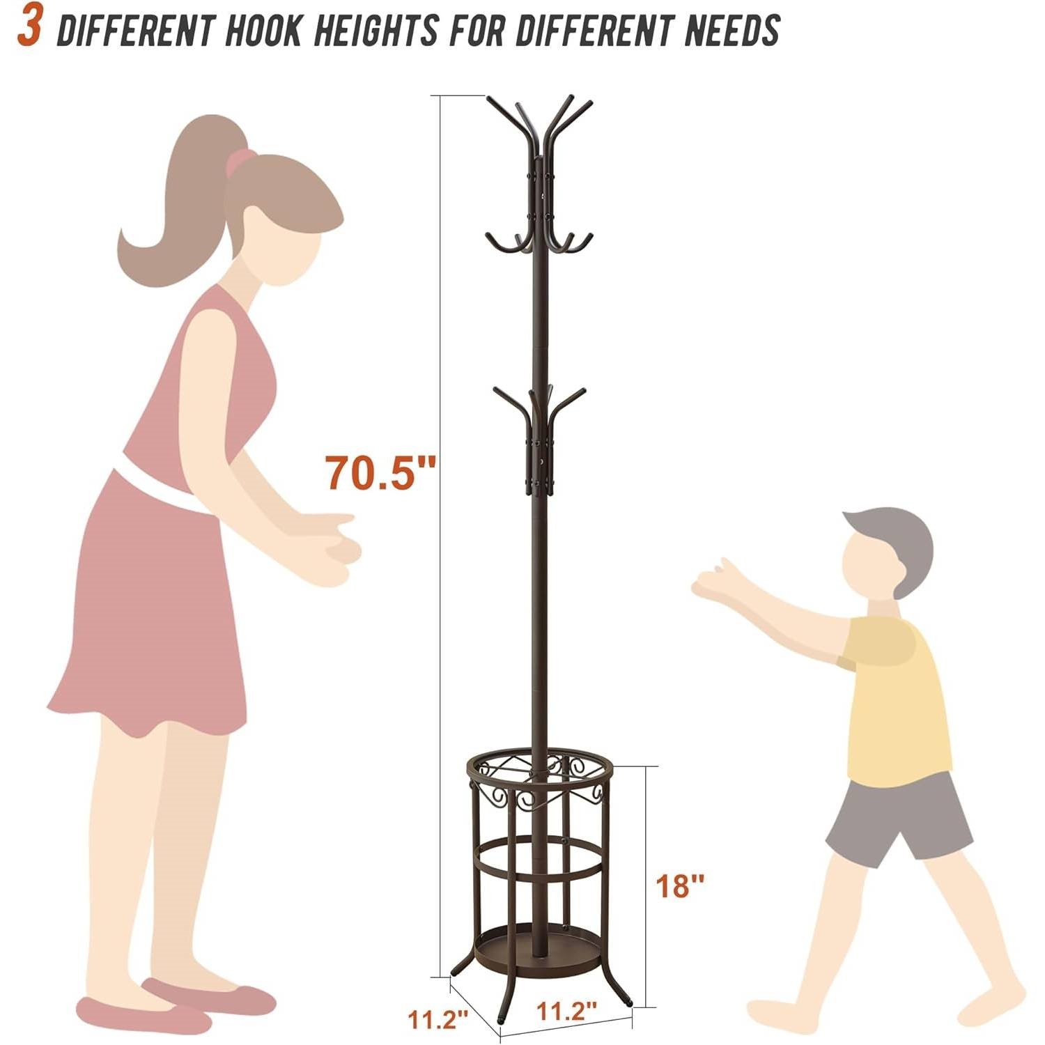 • Versatile: The metal coat rack has 12 hooks at various heights for different users.