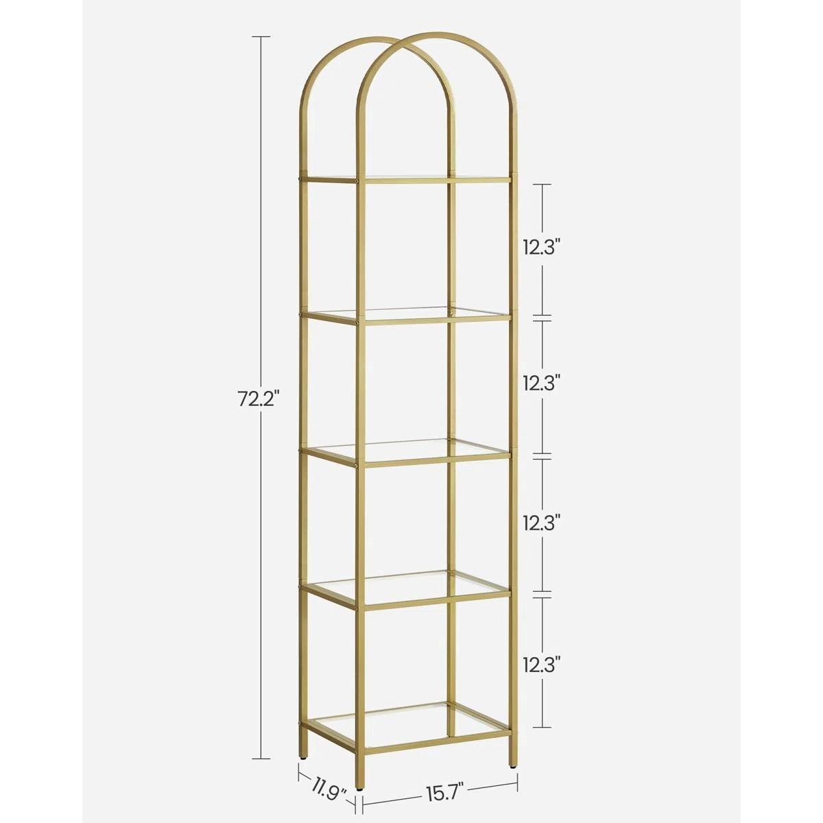 • Arched Top Gold Metal Display Rack Narrow Bookcase with 5 Glass Storage Shelves