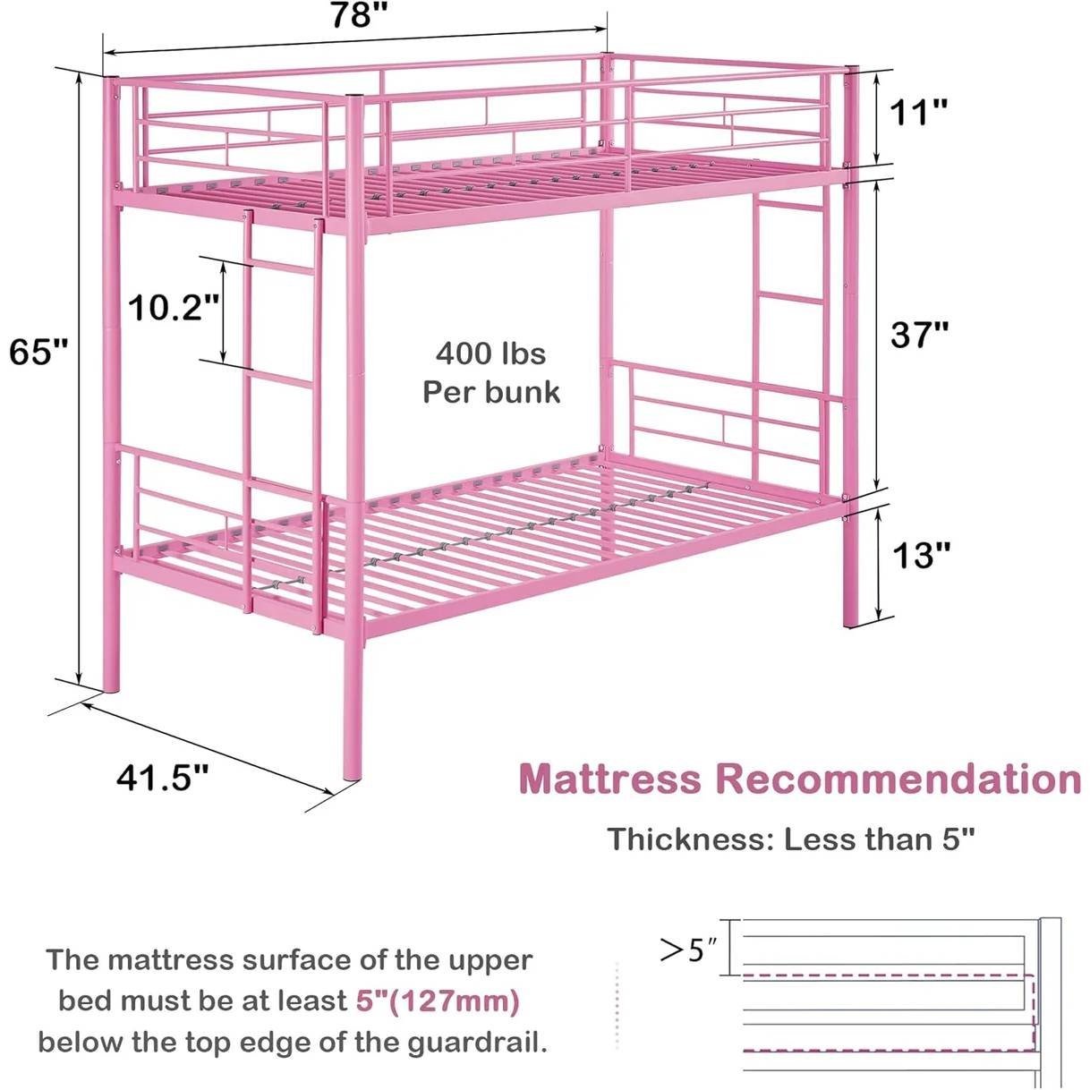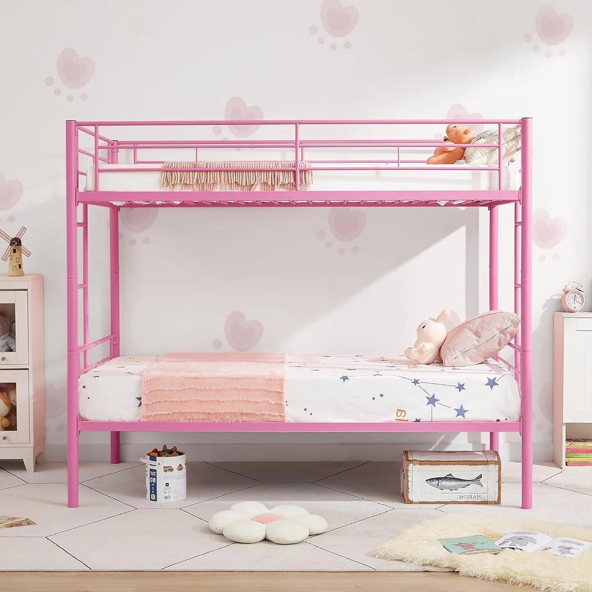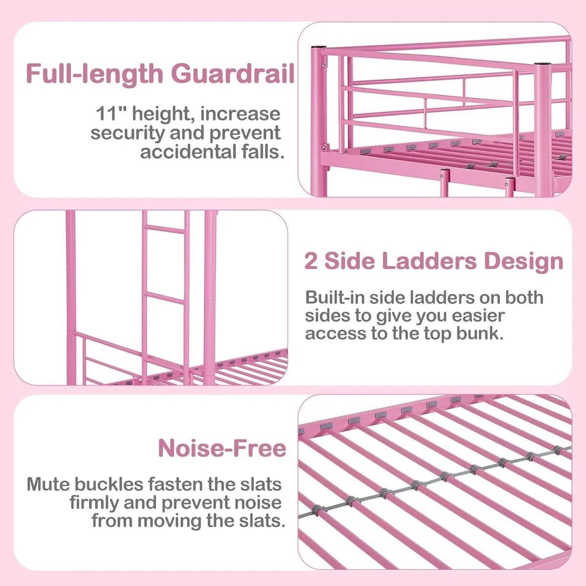 • Pink Metal Twin over Twin Bunk Bed Frame with Two Side Ladders