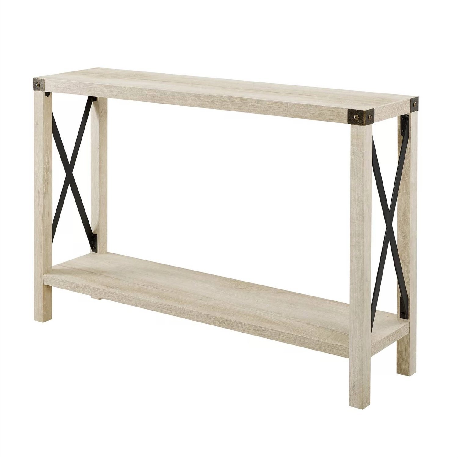 With this Industrial Farmhouse Entryway Table / Sofa Table in White Oak Wood Finish, you’ll have a stylish entryway in no time. The urban industrial and charming, farmhouse style create a warm and inviting feel to your home, which you’ll enjoy having. With metal accents on the corners and x-shaped sides for an intriguing design. A lower shelving made from durable laminate provides a surface for your shoes when you get home or to decorate.